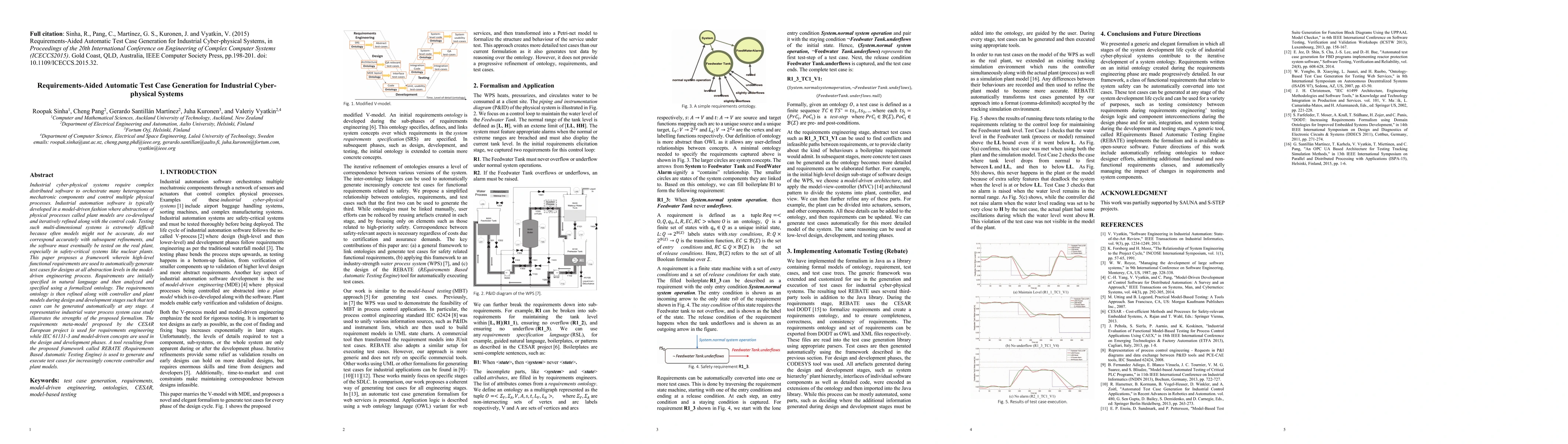 This paper proposes a framework for automatically generating test cases for industrial cyber-physical systems using high-level functional requirements. The method involves specifying requirements in natural language, formalizing them using an ontology, and refining them alongside plant and controller models to enable automated test case generation at various development stages.