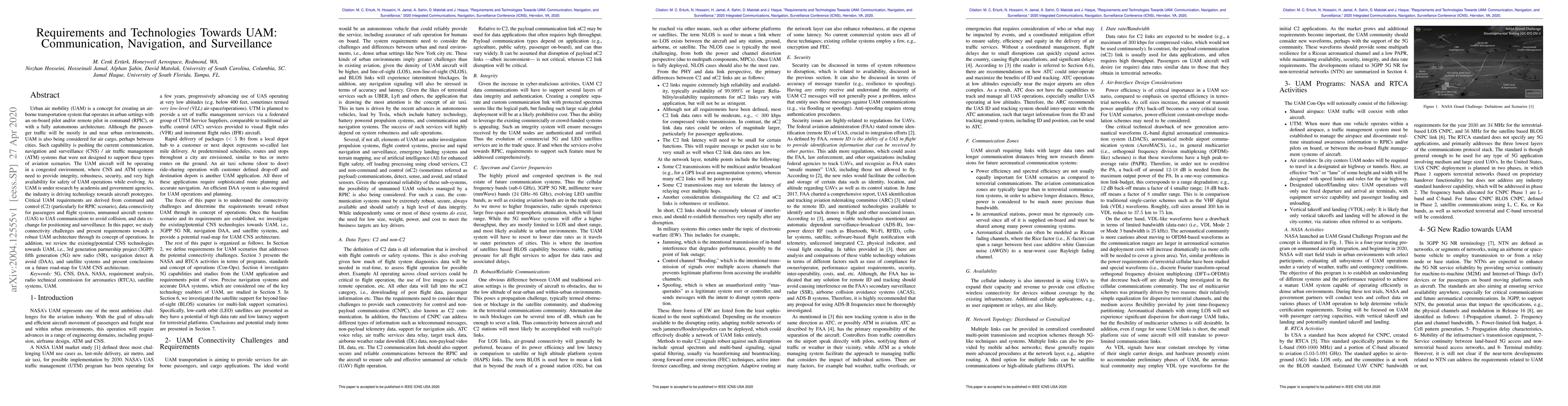 This paper explores the requirements and technologies for Urban Air Mobility (UAM), focusing on the challenges of communication, navigation, and surveillance (CNS) in congested urban environments. It outlines critical UAM requirements and reviews potential CNS technologies, including 5G, detect & avoid systems, and satellite systems, to propose a roadmap for a robust UAM CNS architecture.