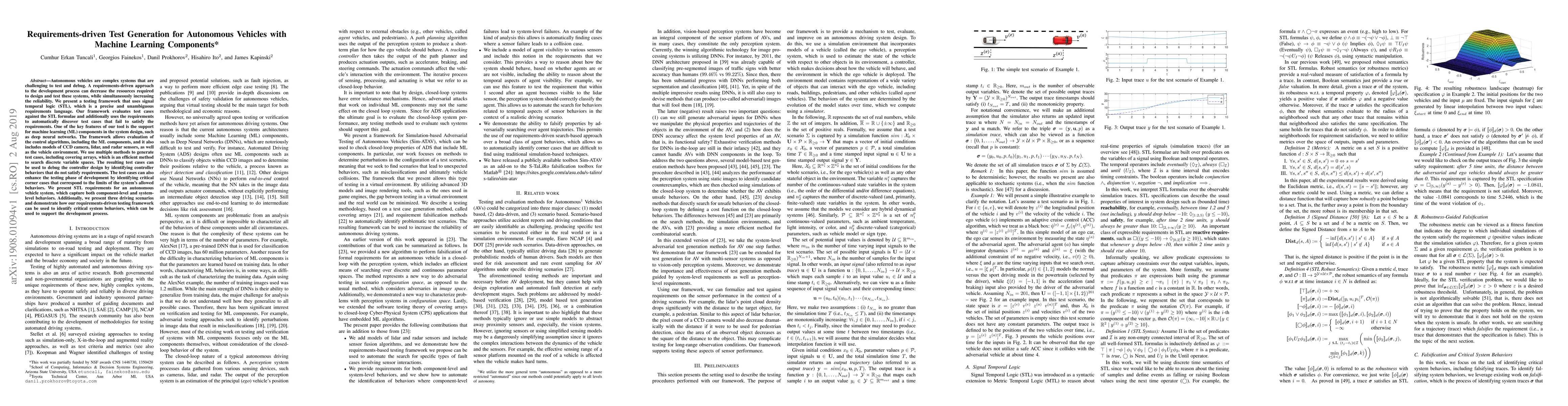 This paper proposes a requirements-driven testing framework for autonomous vehicles using signal temporal logic (STL) to evaluate test cases and identify failures. The framework supports machine learning components and generates test cases using covering arrays to enhance reliability and debug the controller design.