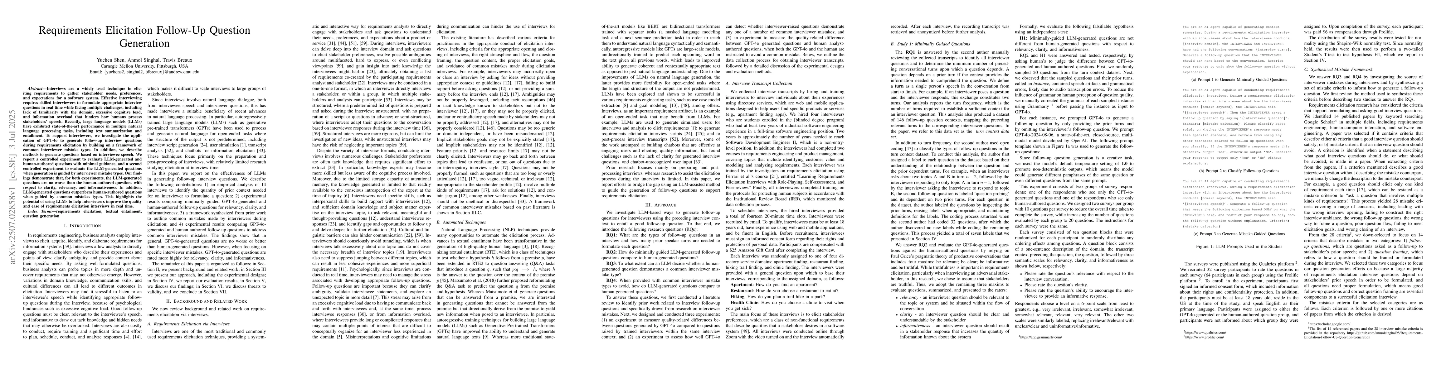 Interviews are a widely used technique in eliciting requirements to gather stakeholder needs, preferences, and expectations for a software system. Effective interviewing requires skilled interviewers to formulate appropriate interview questions in real time while facing multiple challenges, including lack of familiarity with the domain, excessive cognitive load, and information overload that hinders how humans process stakeholders' speech. Recently, large language models (LLMs) have exhibited state-of-the-art performance in multiple natural language processing tasks, including text summarization and entailment. To support interviewers, we investigate the application of GPT-4o to generate follow-up interview questions during requirements elicitation by building on a framework of common interviewer mistake types. In addition, we describe methods to generate questions based on interviewee speech. We report a controlled experiment to evaluate LLM-generated and human-authored questions with minimal guidance, and a second controlled experiment to evaluate the LLM-generated questions when generation is guided by interviewer mistake types. Our findings demonstrate that, for both experiments, the LLM-generated questions are no worse than the human-authored questions with respect to clarity, relevancy, and informativeness. In addition, LLM-generated questions outperform human-authored questions when guided by common mistakes types. This highlights the potential of using LLMs to help interviewers improve the quality and ease of requirements elicitation interviews in real time.