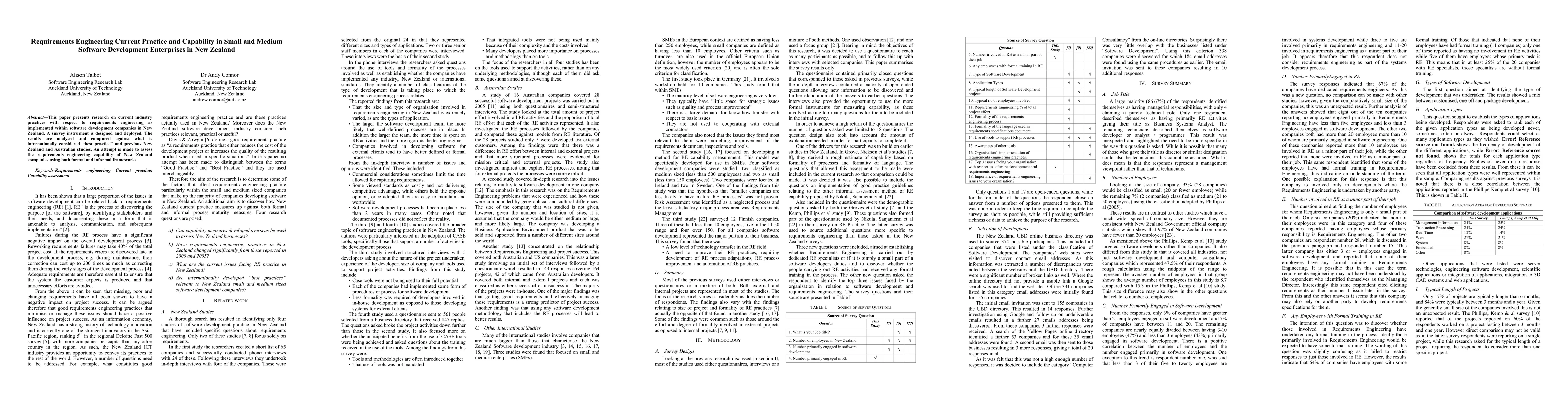 This paper surveys requirements engineering practices in New Zealand's small and medium software development enterprises, comparing local methods against international best practices and previous regional studies to assess their capability.