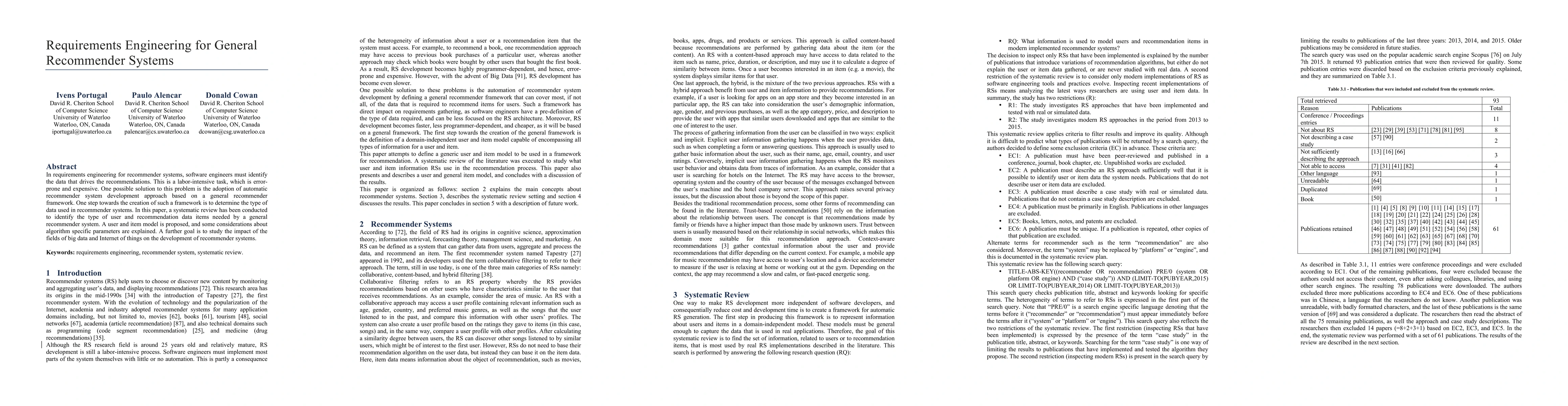 In requirements engineering for recommender systems, software engineers must identify the data that drives the recommendations. This is a labor-intensive task, which is error-prone and expensive. One possible solution to this problem is the adoption of automatic recommender system development approach based on a general recommender framework. One step towards the creation of such a framework is to determine the type of data used in recommender systems. In this paper, a systematic review has been conducted to identify the type of user and recommendation data items needed by a general recommender system. A user and item model is proposed, and some considerations about algorithm specific parameters are explained. A further goal is to study the impact of the fields of big data and Internet of things on the development of recommender systems.