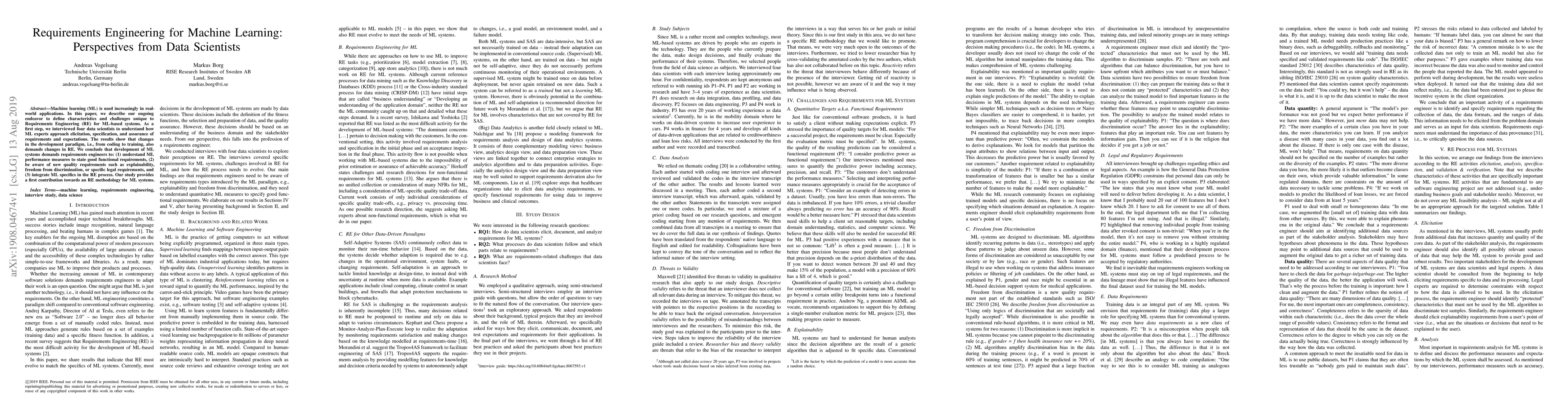This paper investigates the unique challenges of Requirements Engineering (RE) for machine learning (ML) systems, based on interviews with data scientists. It highlights the need for RE professionals to understand ML performance metrics, new quality requirements like explainability, and to integrate ML specifics into the RE process.