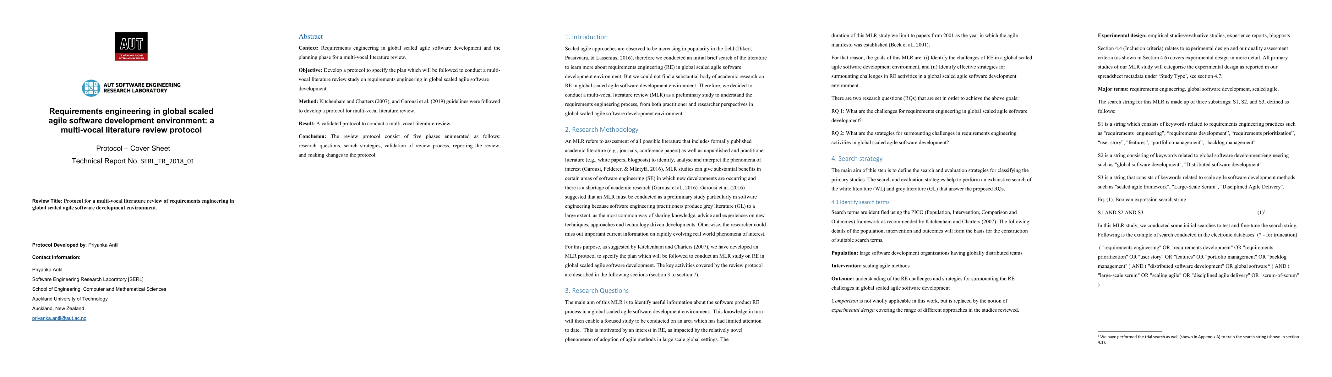 This paper outlines a protocol for conducting a multi-vocal literature review on requirements engineering in global scaled agile software development, following guidelines from Kitchenham and Charters (2007) and Garousi et al. (2019). The protocol includes five phases: defining research questions, search strategies, validation, reporting, and protocol adjustments.