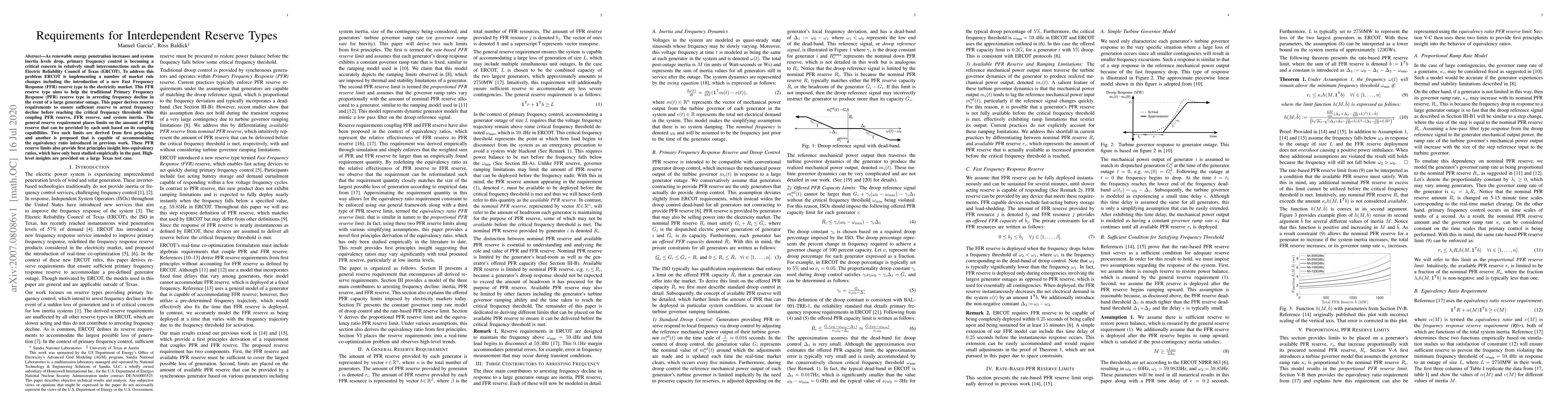 This paper derives reserve requirements for interdependent reserve types in power grids to prevent frequency decline during generator outages, providing insights into equivalency ratios and limitations on Primary Frequency Response reserves.