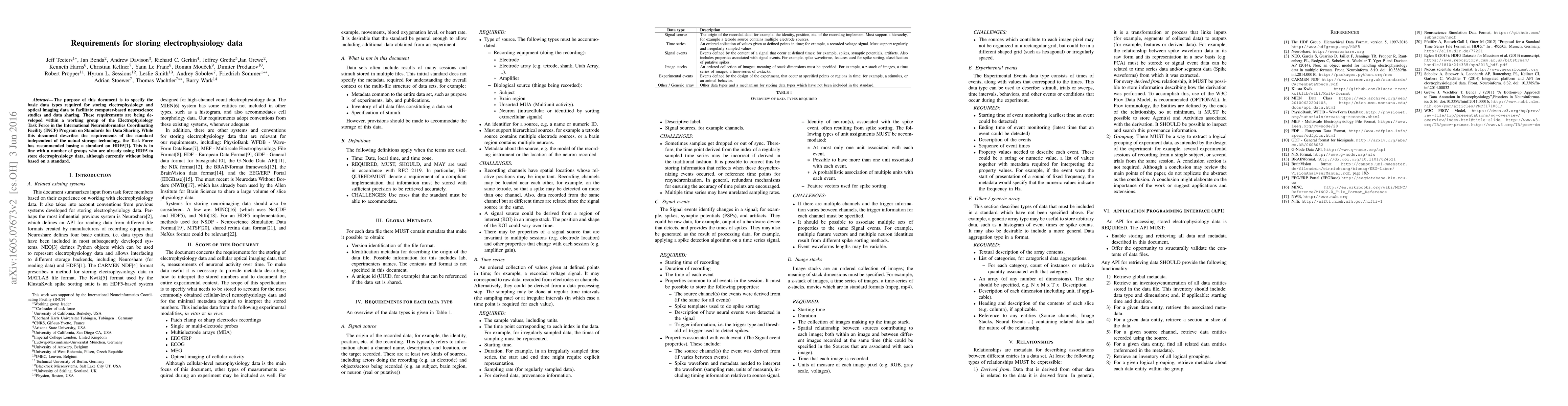 This document outlines the essential data types for storing electrophysiology and optical imaging data to support neuroscience research and data sharing, developed by the Electrophysiology Task Force within the INCF Program. The Task Force recommends using HDF5 as the storage technology, aligning with existing practices.