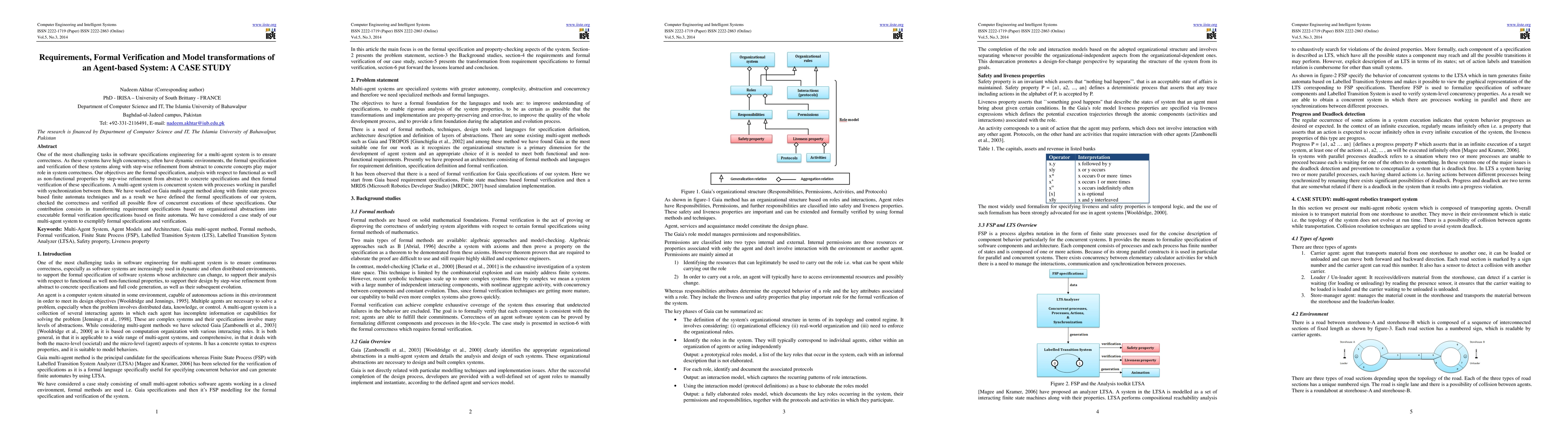 This paper explores formal specification and verification techniques for a multi-agent system, focusing on Gaia method and finite automata. The authors demonstrate step-wise refinement and formal verification to ensure correctness, transforming requirement specifications into executable formal models through a case study.
