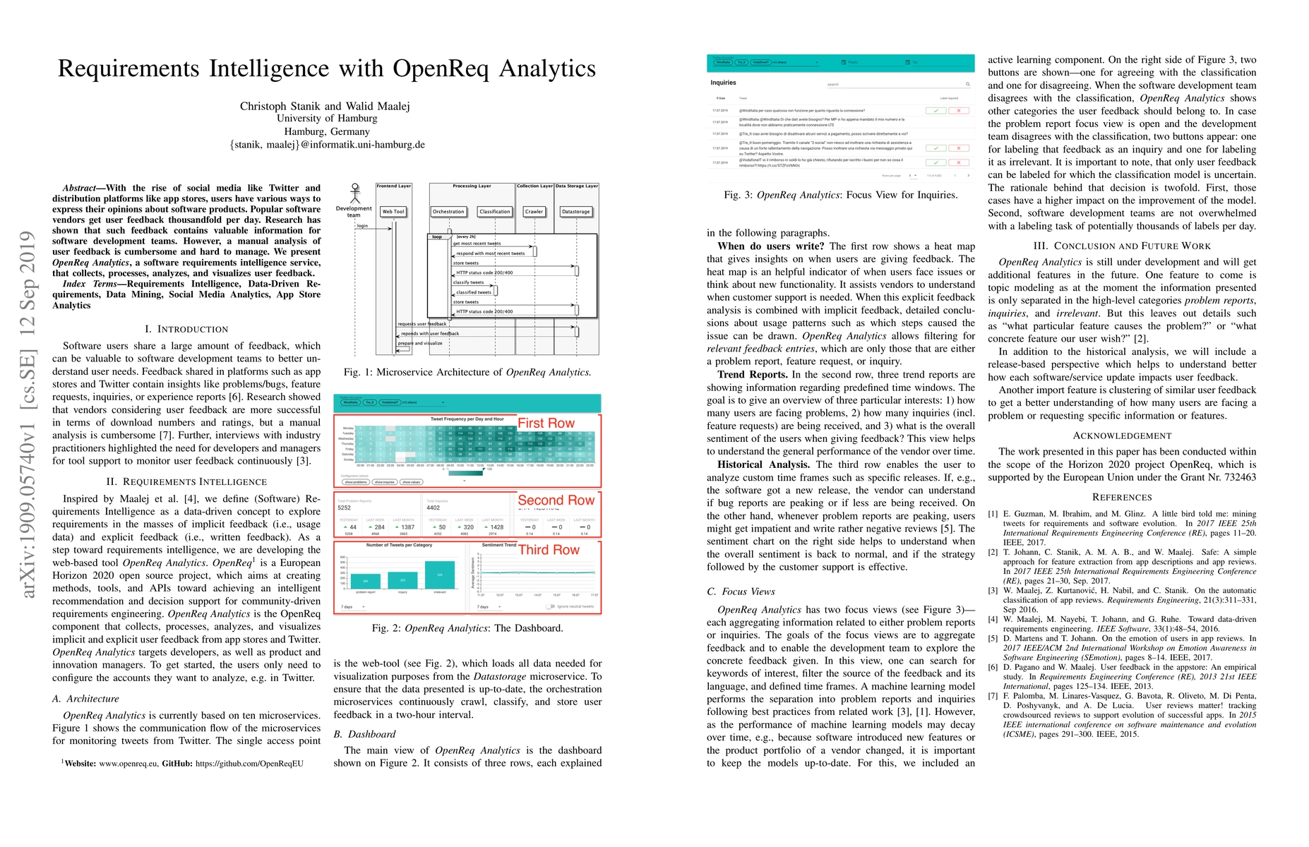 The research presents OpenReq Analytics, a web-based tool based on ten microservices, designed to collect, process, analyze, and visualize user feedback from app stores and Twitter for software requirements intelligence.