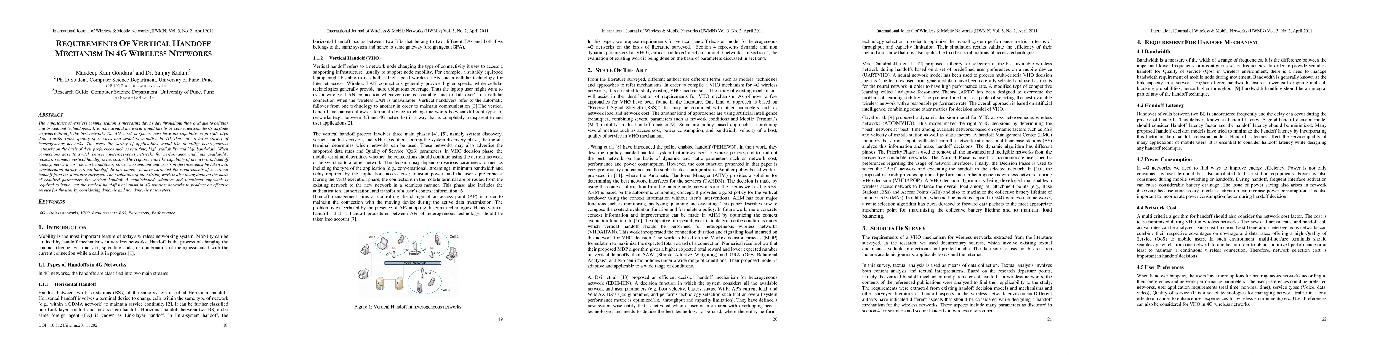 This paper surveys the requirements for vertical handoff mechanisms in 4G wireless networks, emphasizing factors such as network capability, handoff latency, cost, conditions, power consumption, and user preferences. It evaluates existing approaches and advocates for a sophisticated, adaptive, and intelligent method to achieve seamless vertical handoffs.