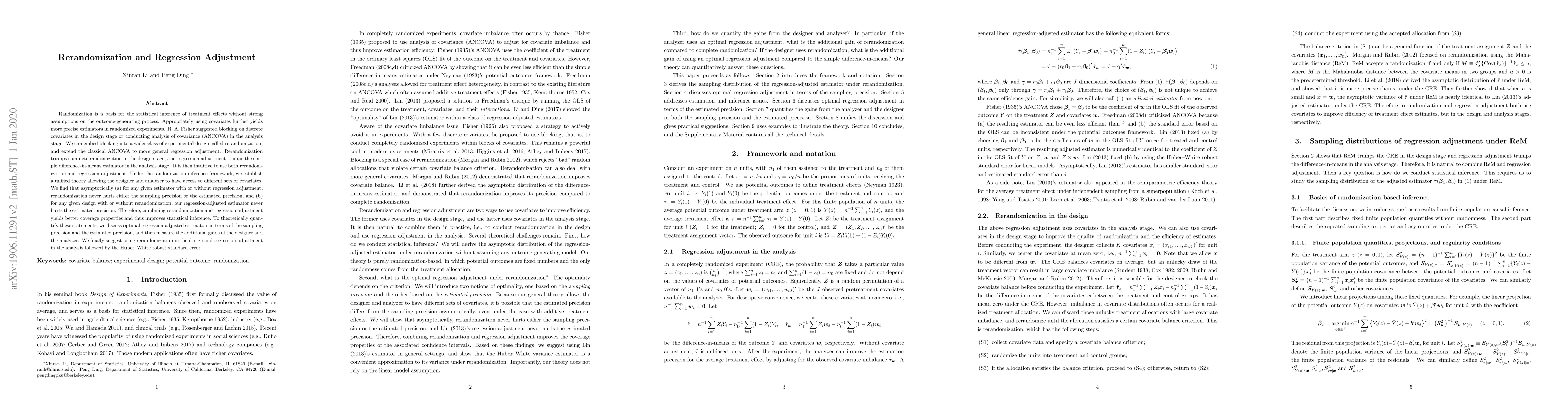 Randomization is a basis for the statistical inference of treatment effects without strong assumptions on the outcome-generating process. Appropriately using covariates further yields more precise estimators in randomized experiments. R. A. Fisher suggested blocking on discrete covariates in the design stage or conducting analysis of covariance (ANCOVA) in the analysis stage. We can embed blocking into a wider class of experimental design called rerandomization, and extend the classical ANCOVA to more general regression adjustment. Rerandomization trumps complete randomization in the design stage, and regression adjustment trumps the simple difference-in-means estimator in the analysis stage. It is then intuitive to use both rerandomization and regression adjustment. Under the randomization-inference framework, we establish a unified theory allowing the designer and analyzer to have access to different sets of covariates. We find that asymptotically (a) for any given estimator with or without regression adjustment, rerandomization never hurts either the sampling precision or the estimated precision, and (b) for any given design with or without rerandomization, our regression-adjusted estimator never hurts the estimated precision. Therefore, combining rerandomization and regression adjustment yields better coverage properties and thus improves statistical inference. To theoretically quantify these statements, we discuss optimal regression-adjusted estimators in terms of the sampling precision and the estimated precision, and then measure the additional gains of the designer and the analyzer. We finally suggest using rerandomization in the design and regression adjustment in the analysis followed by the Huber--White robust standard error.