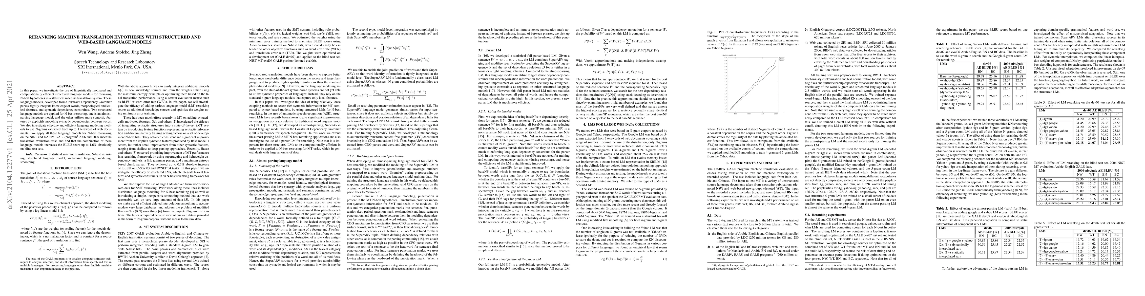 This paper explores the use of structured and web-based language models to rerank machine translation hypotheses, finding that combining these models improves BLEU scores by up to 1.6% on evaluation tasks. The study employs both syntactically-rich structured models and large-scale web N-grams for enhanced translation quality.