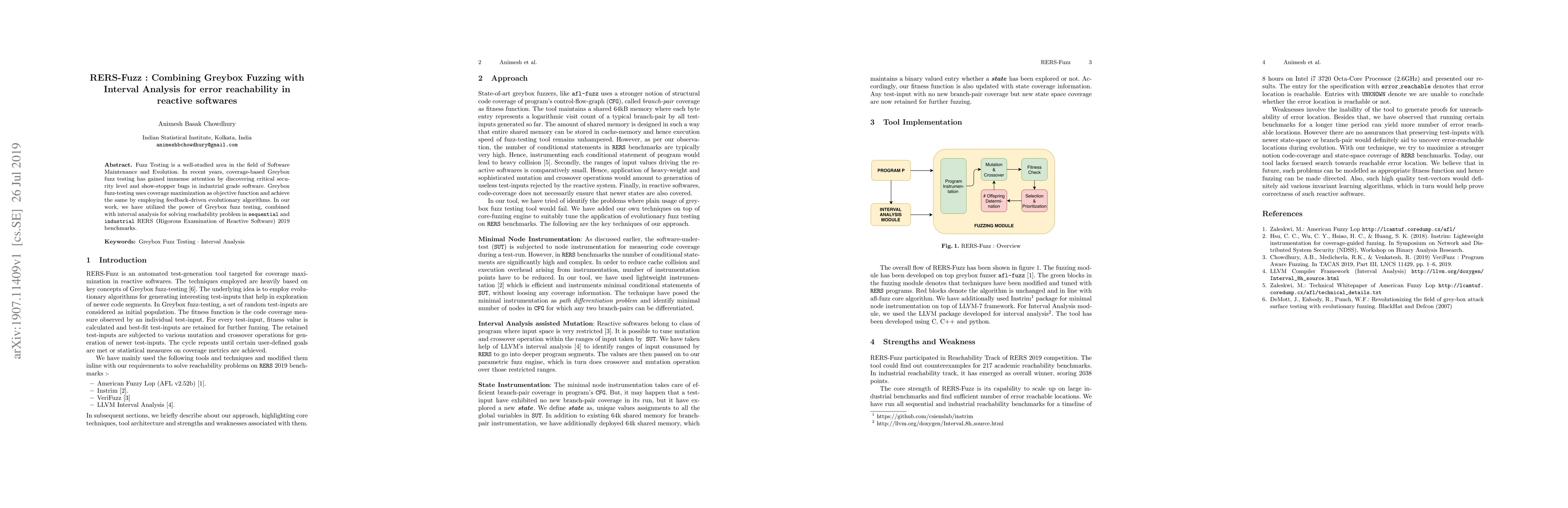 Summary: This paper introduces RERS-Fuzz, a novel approach combining Greybox fuzz testing with interval analysis to enhance error reachability in reactive software. The method leverages coverage-based Greybox fuzzing and interval analysis to solve reachability problems in industrial RERS benchmarks.