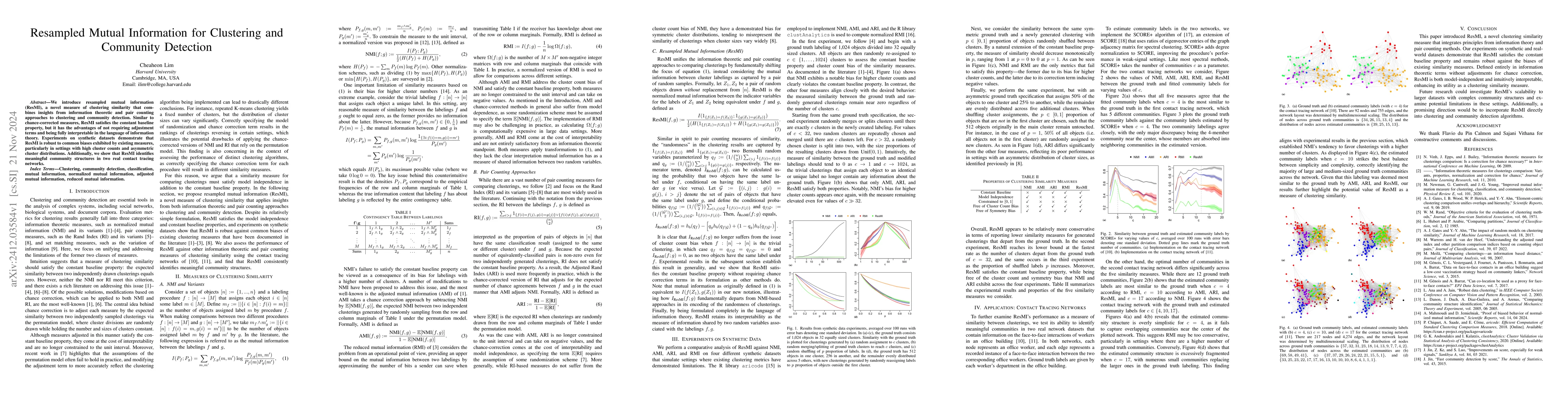 Resampled mutual information (ResMI) is a new measure for clustering similarity that effectively combines information theory and pair counting methods. It demonstrates robustness against biases in high-cluster-count and asymmetric datasets, and successfully identifies community structures in real contact tracing networks.
