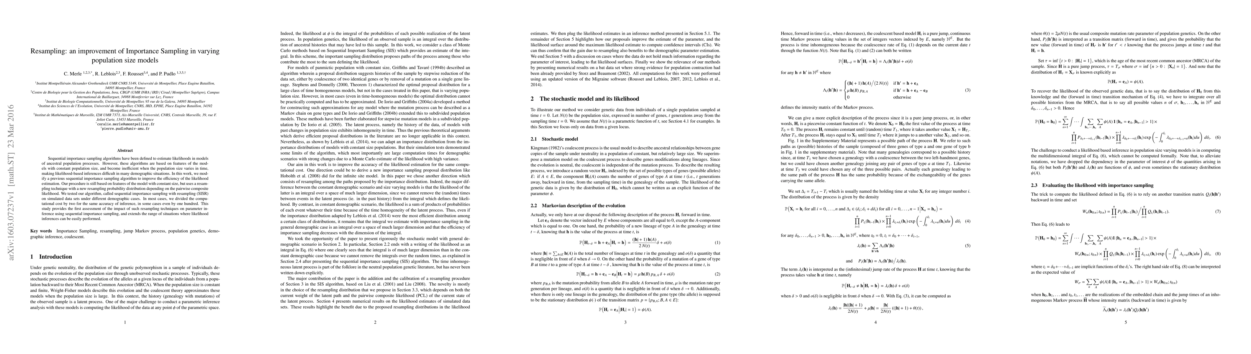 This paper proposes a modified sequential importance sampling algorithm called SISR that incorporates resampling to improve likelihood estimation in models with varying population sizes. The new resampling technique significantly reduces computational costs while maintaining accuracy, extending the applicability of likelihood-based inferences in diverse demographic scenarios.