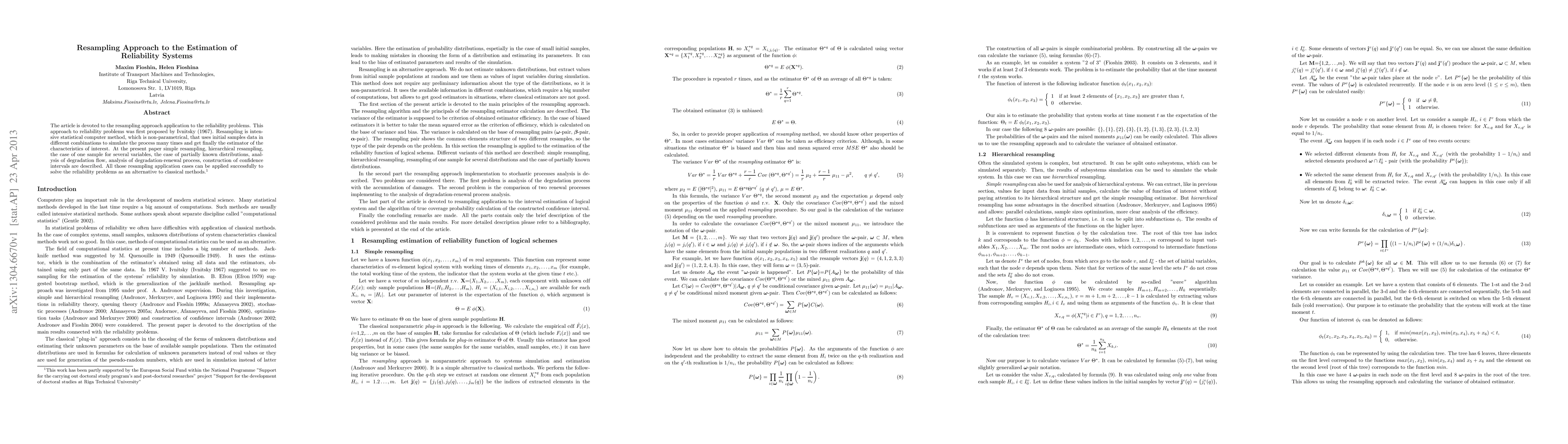 The article is devoted to the resampling approach application to the reliability problems. This approach to reliability problems was first proposed by Ivnitsky (1967). Resampling is intensive statistical computer method, which is non-parametrical, that uses initial samples data in different combinations to simulate the process many times and get finally the estimator of the characteristics of interest. At the present paper simple resampling, hierarchical resampling, the case of one sample for several variables, the case of partially known distributions, analysis of degradation flow, analysis of degradation-renewal process, construction of confidence intervals are described. All those resampling application cases can be applied successfully to solve the reliability problems as an alternative to classical methods.