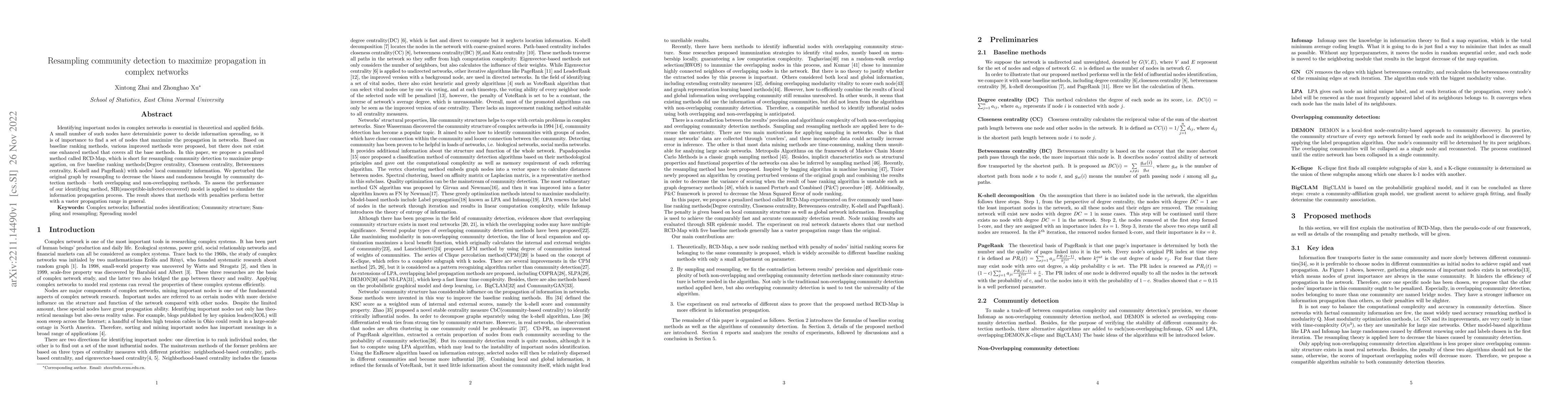 This paper proposes a penalized method called RCD-Map to identify important nodes in complex networks that maximize information propagation. The method resamples the original graph to mitigate biases from community detection, and it outperforms baseline ranking methods in simulations using the SIR model.