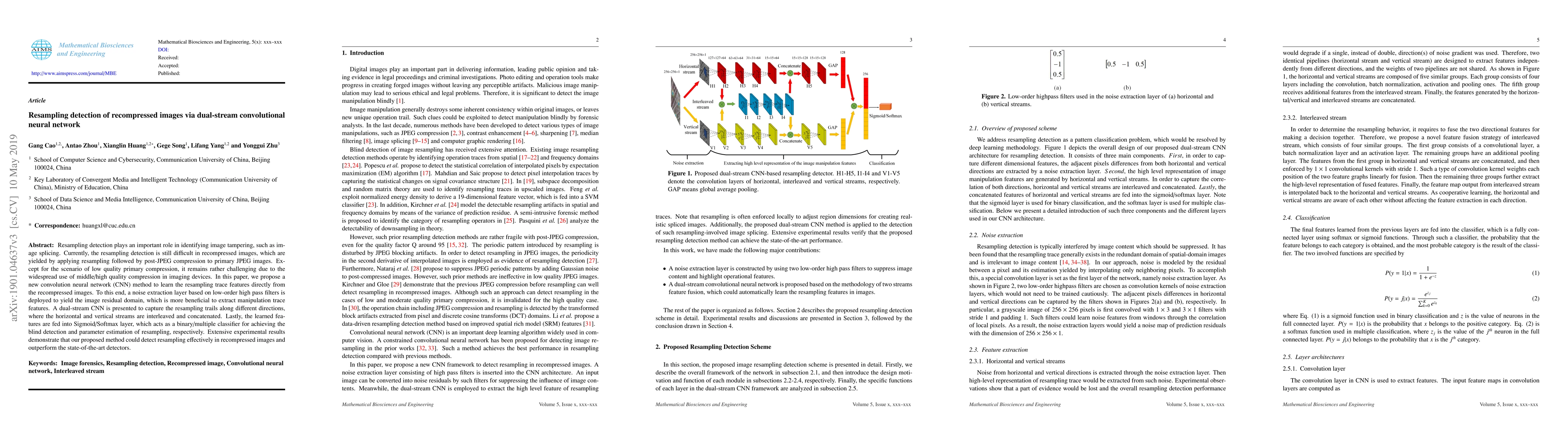The paper proposes a deep learning-based method using a noise extraction layer and a dual-stream CNN to detect resampling in recompressed images. It employs a noise extraction layer with low-order high-pass filters to extract noise residuals and a dual-stream CNN to capture resampling traces from noise maps in different directions.