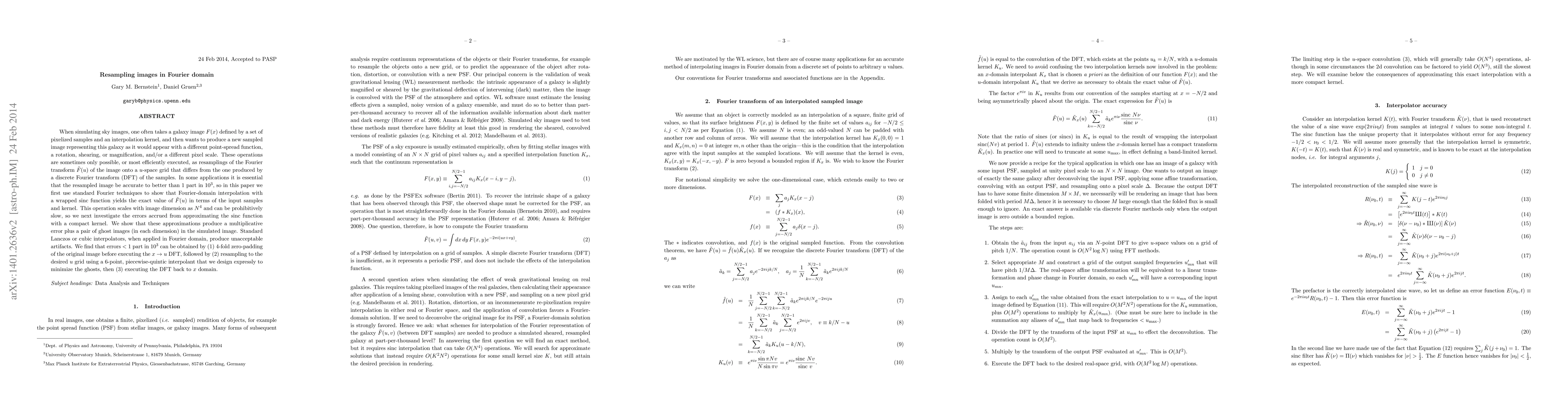 When simulating sky images, one often takes a galaxy image $F(x)$ defined by a set of pixelized samples and an interpolation kernel, and then wants to produce a new sampled image representing this galaxy as it would appear with a different point-spread function, a rotation, shearing, or magnification, and/or a different pixel scale. These operations are sometimes only possible, or most efficiently executed, as resamplings of the Fourier transform $\tilde F(u)$ of the image onto a $u$-space grid that differs from the one produced by a discrete Fourier transform (DFT) of the samples. In some applications it is essential that the resampled image be accurate to better than 1 part in $10^3$, so in this paper we first use standard Fourier techniques to show that Fourier-domain interpolation with a wrapped sinc function yields the exact value of $\tilde F(u)$ in terms of the input samples and kernel. This operation scales with image dimension as $N^4$ and can be prohibitively slow, so we next investigate the errors accrued from approximating the sinc function with a compact kernel. We show that these approximations produce a multiplicative error plus a pair of ghost images (in each dimension) in the simulated image. Standard Lanczos or cubic interpolators, when applied in Fourier domain, produce unacceptable artifacts. We find that errors $<1$ part in $10^3$ can be obtained by (1) 4-fold zero-padding of the original image before executing the $x\rightarrow u$ DFT, followed by (2) resampling to the desired $u$ grid using a 6-point, piecewise-quintic interpolant that we design expressly to minimize the ghosts, then (3) executing the DFT back to $x$ domain.