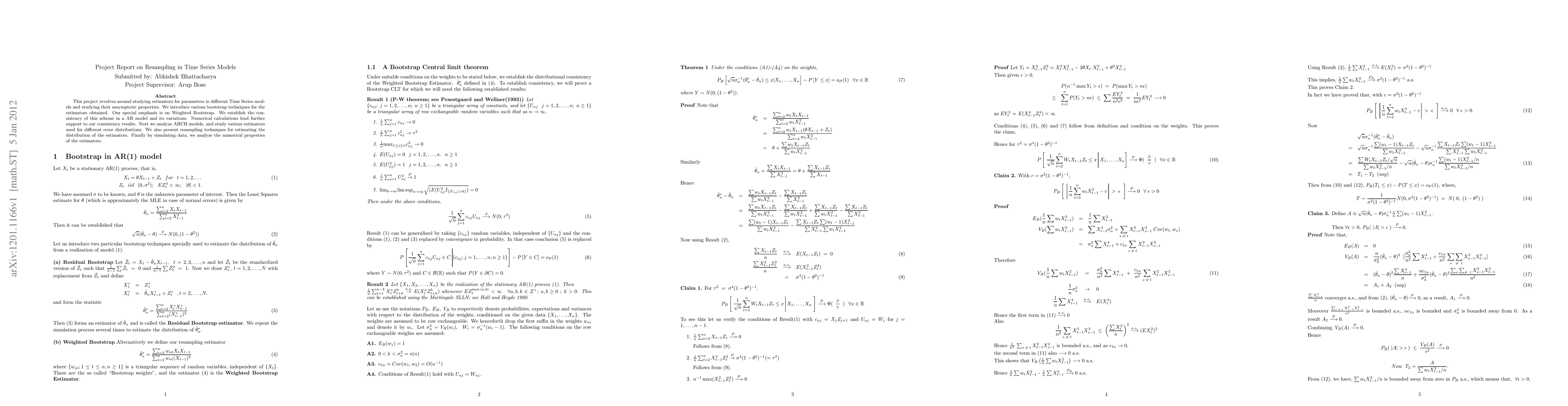 This project revolves around studying estimators for parameters in different Time Series models and studying their assymptotic properties. We introduce various bootstrap techniques for the estimators obtained. Our special emphasis is on Weighted Bootstrap. We establish the consistency of this scheme in a AR model and its variations. Numerical calculations lend further support to our consistency results. Next we analyze ARCH models, and study various estimators used for different error distributions. We also present resampling techniques for estimating the distribution of the estimators. Finally by simulating data, we analyze the numerical properties of the estimators.