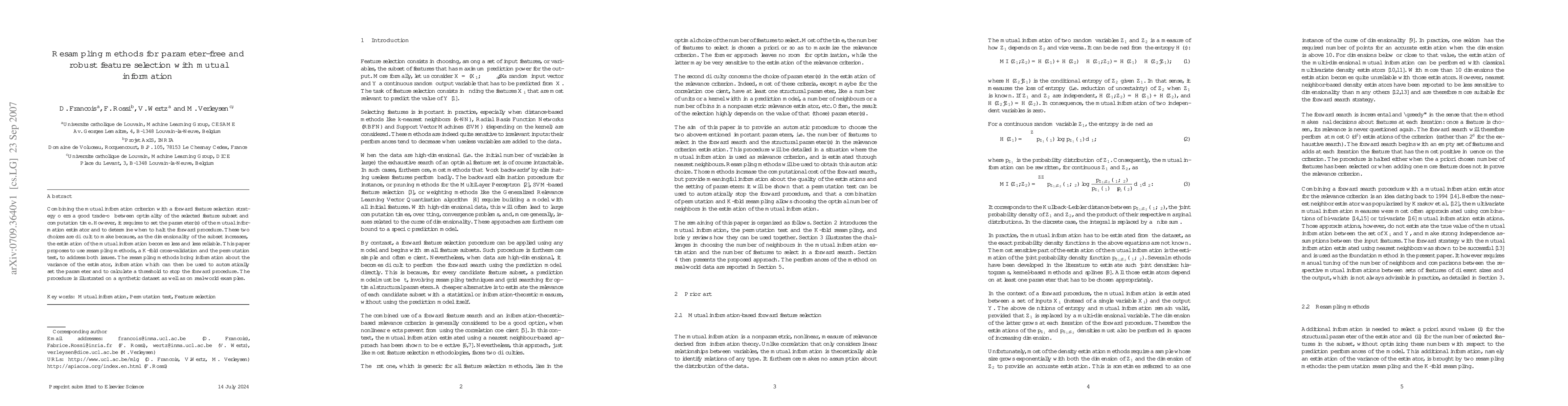 This paper proposes using resampling methods like K-fold cross-validation and permutation tests to enhance parameter-free and robust feature selection based on mutual information. These methods provide insights into the estimator's variance, enabling automatic parameter setting and halting criteria for forward feature selection.