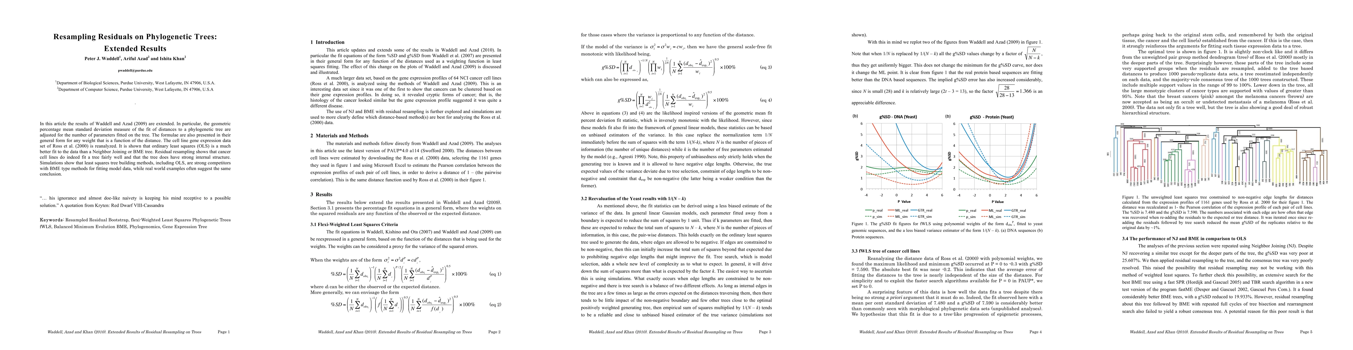 In this article the results of Waddell and Azad (2009) are extended. In particular, the geometric percentage mean standard deviation measure of the fit of distances to a phylogenetic tree is adjusted for the number of parameters fitted to the model. The formulae are also presented in their general form for any weight that is a function of the distance. The cell line gene expression data set of Ross et al. (2000) is reanalyzed. It is shown that ordinary least squares (OLS) is a much better fit to the data than a Neighbor Joining or BME tree. Residual resampling shows that cancer cell lines do indeed fit a tree fairly well and that the tree does have strong internal structure. Simulations show that least squares tree building methods, including OLS, are strong competitors with BME type methods for fitting model data, while real world examples often suggest the same conclusion.