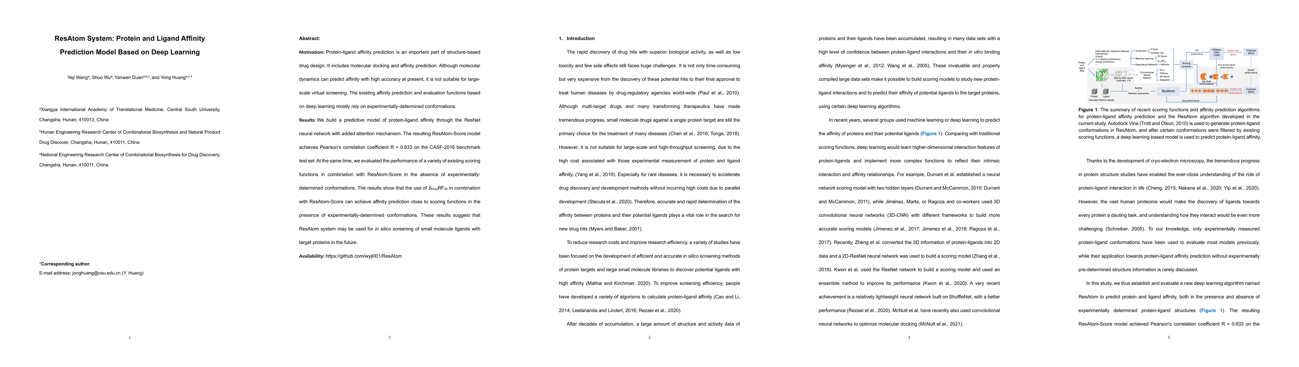 The ResAtom system uses a ResNet neural network with an attention mechanism to predict protein-ligand affinity, achieving a Pearson's correlation coefficient of 0.833 on a benchmark test set. Combining it with ΔVinaRF20 enhances its predictive performance, suggesting its potential for large-scale virtual screening.