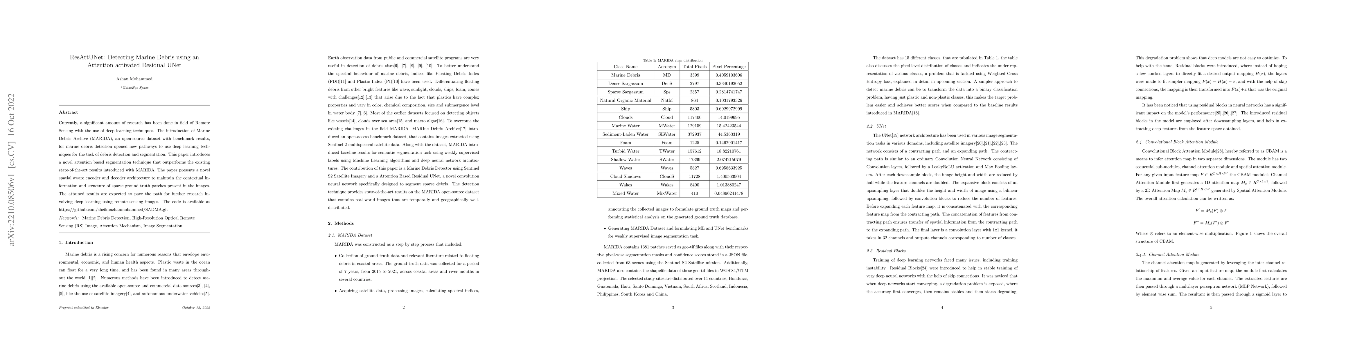 This paper introduces ResAttUNet, an attention-activated residual UNet for detecting marine debris using remote sensing images. It outperforms existing methods on the MARIDA dataset, leveraging a spatial aware encoder-decoder architecture to maintain contextual information, and the code is available for further research.