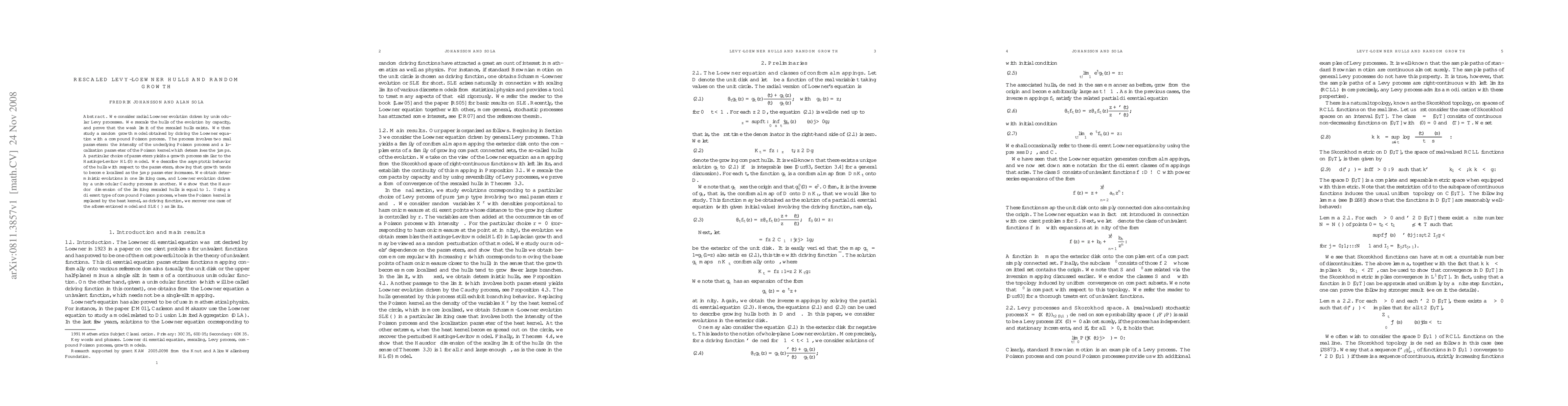 We consider radial Loewner evolution driven by unimodular L\'evy processes. We rescale the hulls of the evolution by capacity, and prove that the weak limit of the rescaled hulls exists. We then study a random growth model obtained by driving the Loewner equation with a compound Poisson process. The process involves two real parameters: the intensity of the underlying Poisson process and a localization parameter of the Poisson kernel which determines the jumps. A particular choice of parameters yields a growth process similar to the Hastings-Levitov $\rm{HL}(0)$ model. We describe the asymptotic behavior of the hulls with respect to the parameters, showing that growth tends to become localized as the jump parameter increases. We obtain deterministic evolutions in one limiting case, and Loewner evolution driven by a unimodular Cauchy process in another. We show that the Hausdorff dimension of the limiting rescaled hulls is equal to 1. Using a different type of compound Poisson process, where the Poisson kernel is replaced by the heat kernel, as driving function, we recover one case of the aforementioned model and $\rm{SLE}(\kappa)$ as limits.