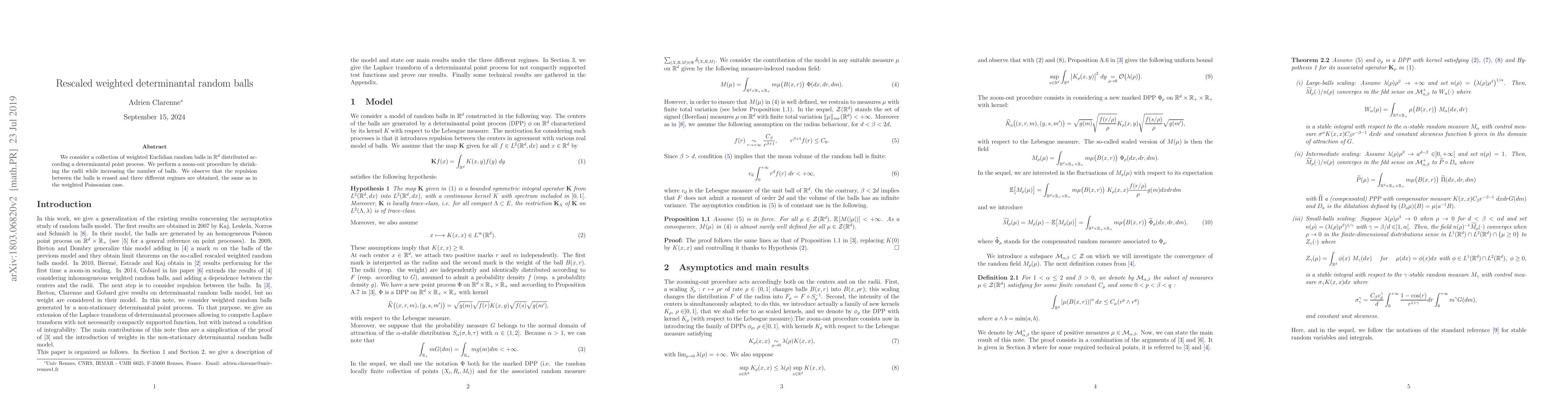 Summary: This paper studies a collection of weighted Euclidean random balls in R^d governed by a determinantal point process. By rescaling the radii and number of balls, it reveals that the repulsion between the balls diminishes, leading to three distinct regimes similar to those found in the weighted Poissonian case.