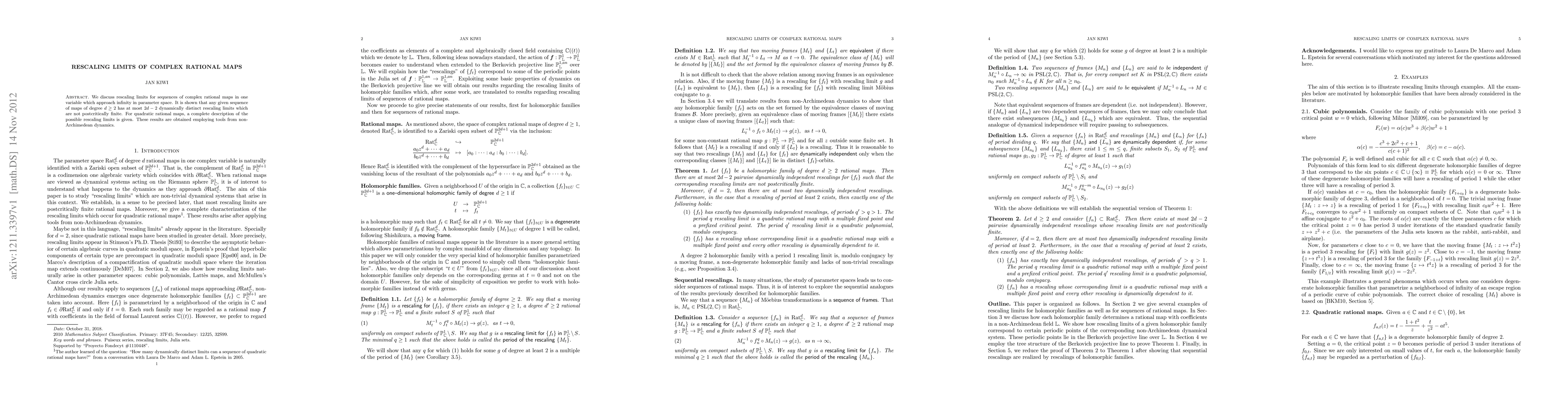 This research explores the rescaling limits of sequences of complex rational maps approaching infinity, demonstrating that degree $d \ge 2$ maps have at most $2d-2$ dynamically distinct limits that are not postcritically finite, with complete characterization for quadratic maps using non-Archimedean dynamics.