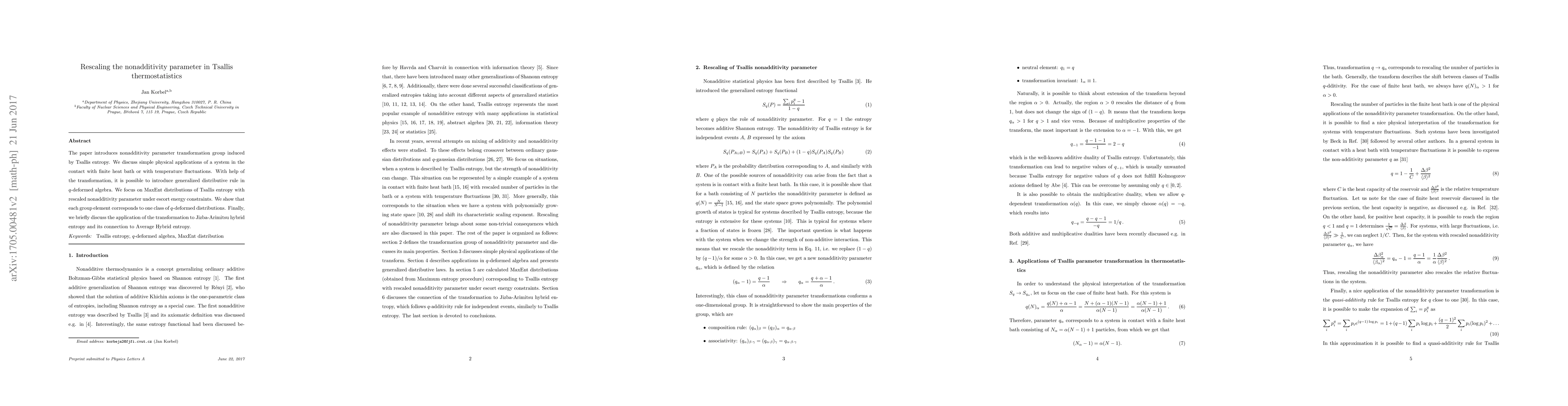 The paper introduces nonadditivity parameter transformation group induced by Tsallis entropy. We discuss simple physical applications of a system in the contact with finite heat bath or with temperature fluctuations. With help of the transformation, it is possible to introduce generalized distributive rule in q-deformed algebra. We focus on MaxEnt distributions of Tsallis entropy with rescaled nonadditivity parameter under escort energy constraints. We show that each group element corresponds to one class of q-deformed distributions. Finally, we briefly discuss the application of the transformation to Jizba-Arimitsu Hybrid entropy and its connection to Average Hybrid entropy.