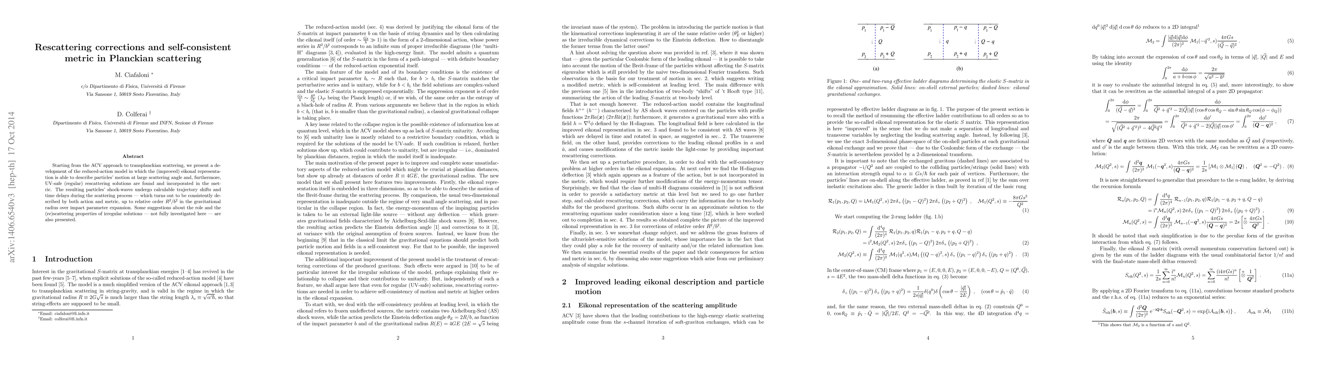 Starting from the ACV approach to transplanckian scattering, we present a development of the reduced-action model in which the (improved) eikonal representation is able to describe particles' motion at large scattering angle and, furthermore, UV-safe (regular) rescattering solutions are found and incorporated in the metric. The resulting particles' shock-waves undergo calculable trajectory shifts and time delays during the scattering process --- which turns out to be consistently described by both action and metric, up to relative order $R^2/b^2$ in the gravitational radius over impact parameter expansion. Some suggestions about the role and the (re)scattering properties of irregular solutions --- not fully investigated here --- are also presented.