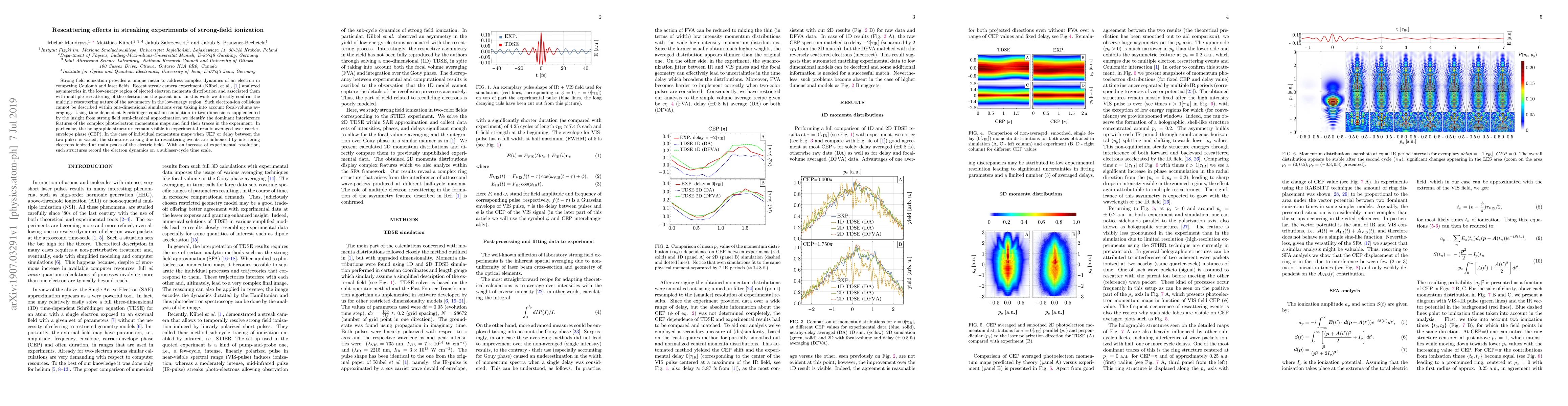 Strong field ionization provides a unique mean to address complex dynamics of an electron in competing Coulomb and laser fields. Recent streak camera experiment (K\"ubel, et al., Phys. Rev. Lett. 119, 183201) analyzed asymmetries in the low-energy region of ejected electron momenta distribution and associated them with multiple rescattering of the electron on the parent ion. In this work we directly confirm the multiple rescattering nature of the asymmetry in the low-energy region. Such electron-ion collisions cannot be described within one-dimensional simulations even taking into account focal-volume averaging. Using time-dependent Schr\"odinger equation simulation in two dimensions supplemented by the insight from strong field semi-classical approximation we identify the dominant interference features of the complex photoelectron momentum maps and find their traces in the experiment. In particular, the holographic structures remain visible in experimental results averaged over carrier-envelope phase (CEP). In the case of individual momentum maps when CEP or delay between the two pulses is varied, the structures arising due to rescattering events are influenced by interfering electrons ionized at main peaks of the electric field. With an increase of experimental resolution, such structures record the electron dynamics on a sublaser-cycle time scale.