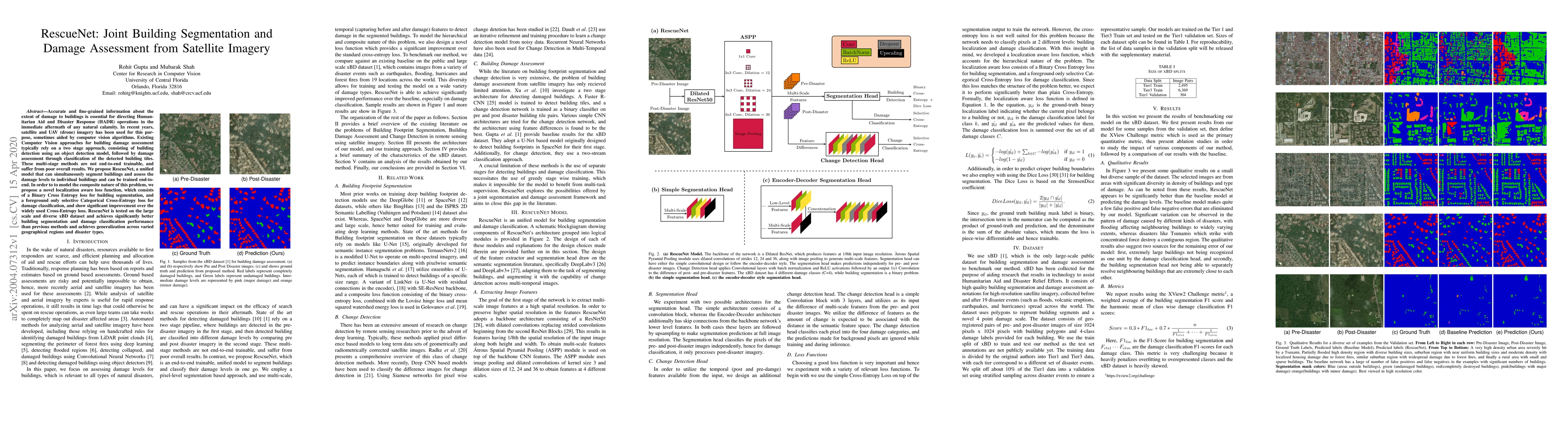 RescueNet proposes a unified model for simultaneous building segmentation and damage assessment from satellite imagery, achieving end-to-end training and superior performance compared to traditional multi-stage methods. The novel localization aware loss function significantly enhances the model's accuracy and generalization across diverse disaster scenarios.
