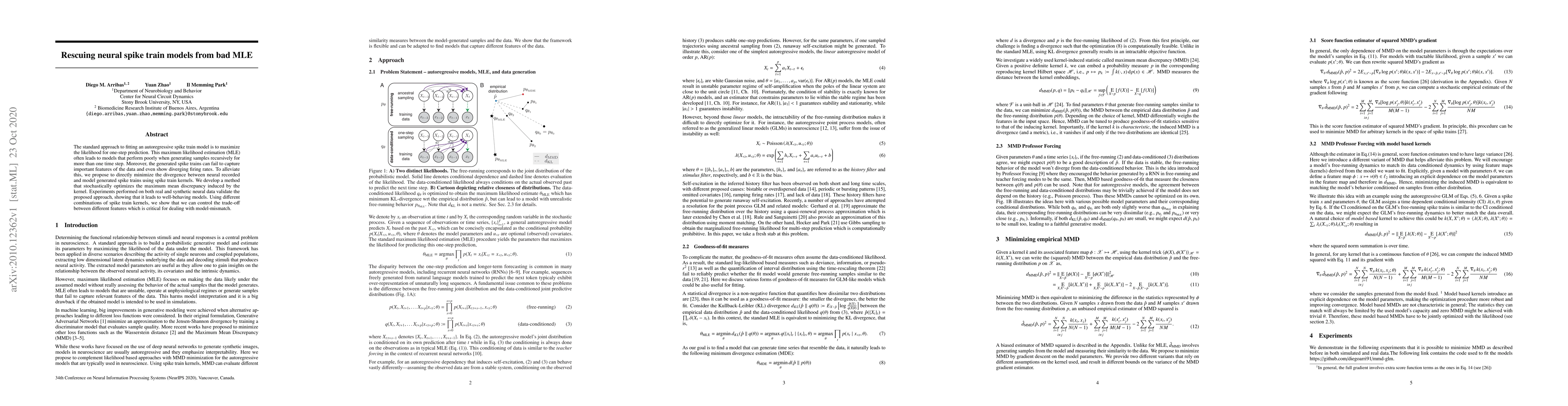 This paper proposes a new method to improve autoregressive spike train models by minimizing the divergence between recorded and generated spike trains using spike train kernels, instead of traditional maximum likelihood estimation. This approach leads to better-performing models that capture important data features and avoids issues like diverging firing rates.