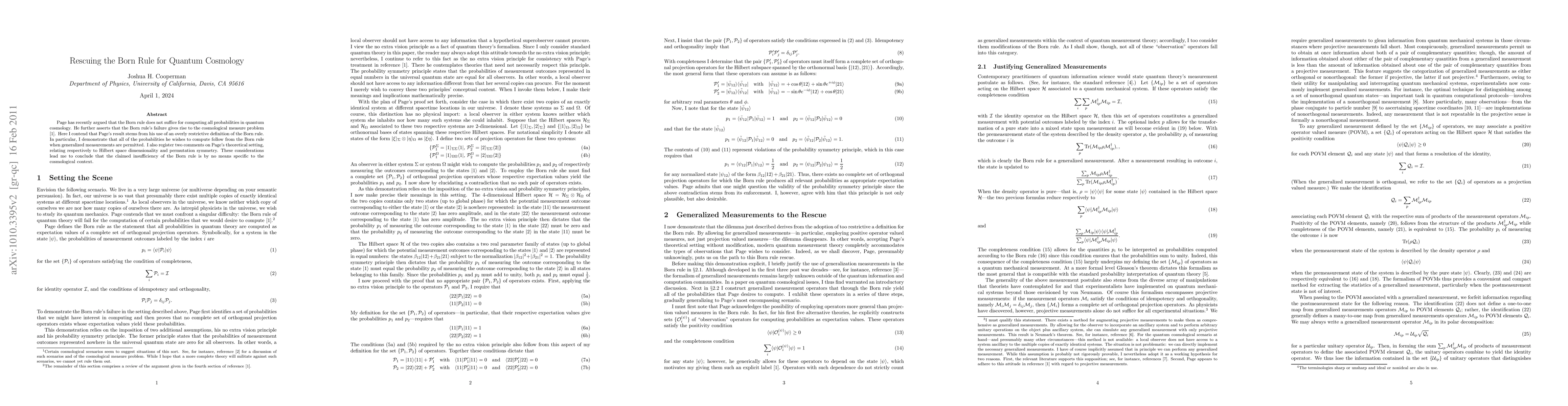 Page has recently argued that the Born rule does not suffice for computing all probabilities in quantum cosmology. He further asserts that the Born rule's failure gives rise to the cosmological measure problem. Here I contend that Page's result stems from his use of an overly restrictive definition of the Born rule. In particular, I demonstrate that all of the probabilities he wishes to compute follow from the Born rule when generalized measurements are permitted. I also register two comments on Page's theoretical setting, relating respectively to Hilbert space dimensionality and permutation symmetry. These considerations lead me to conclude that the claimed insufficiency of the Born rule is by no means specific to the cosmological context.