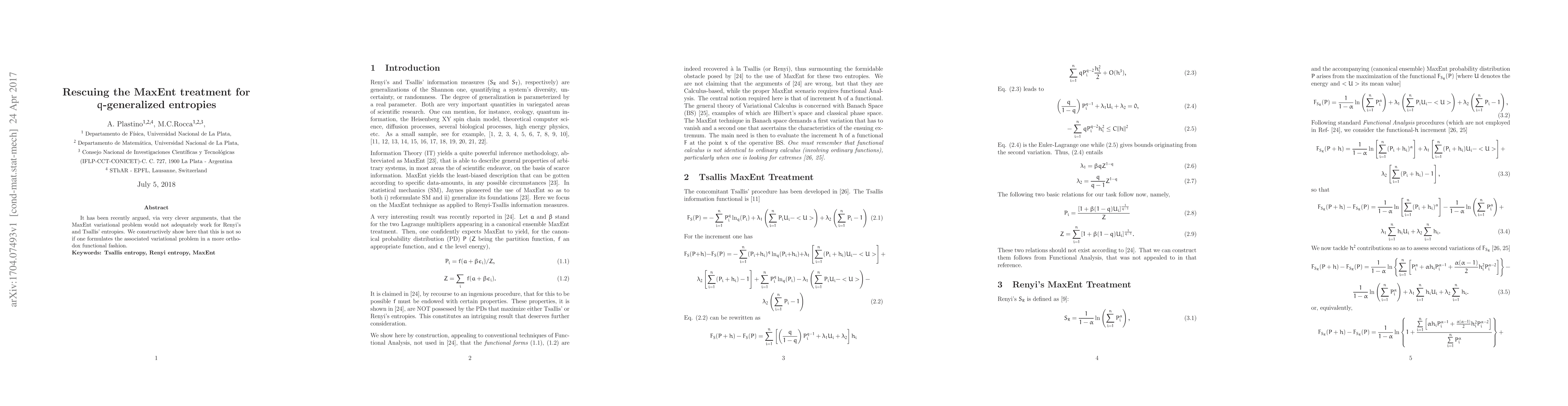 It has been recently argued, via very clever arguments, that the MaxEnt variational problem would not adequately work for Renyi's and Tsallis' entropies. We constructively show here that this is not so if one formulates the associated variational problem in a more orthodox functional fashion.