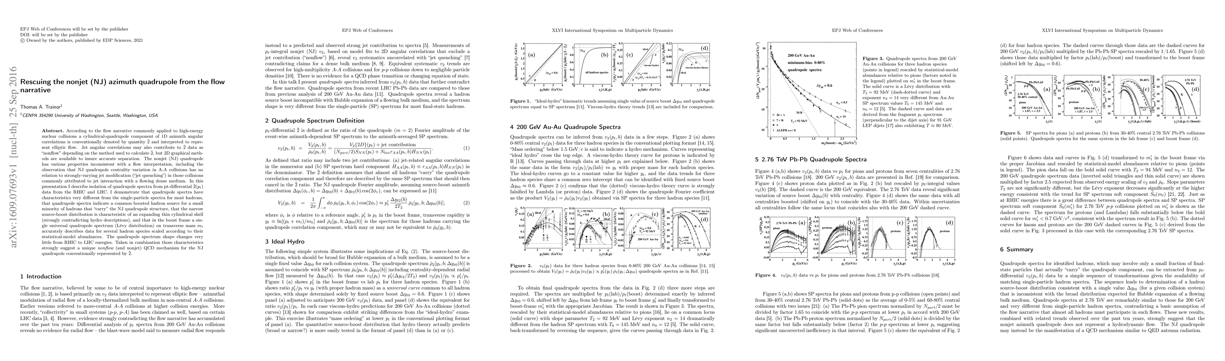 The paper isolates nonjet azimuth quadrupole spectra from pt-differential v2 data at RHIC and LHC, revealing unique nonflow QCD mechanism for the nonjet quadrupole traditionally denoted by v2. These spectra indicate a common boosted source for a small hadron fraction, suggest an expanding thin cylindrical shell, and follow a universal L'evy distribution on transverse mass across RHIC to LHC energies.