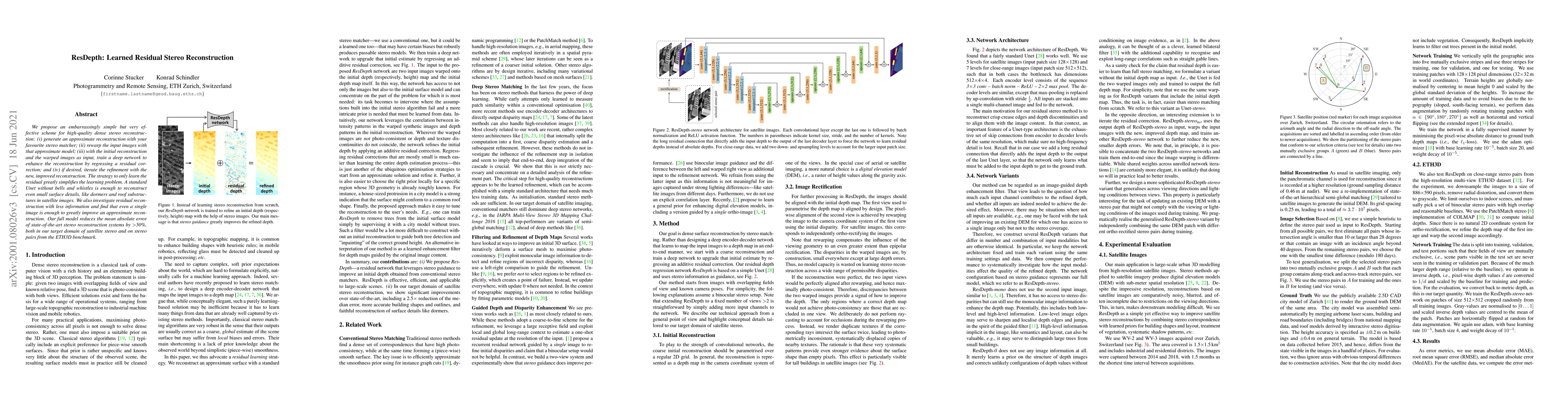 A new stereo reconstruction method uses a simplified approach to improve accuracy, reducing errors by over 50% in satellite images and benchmark datasets. It generates an initial approximation, warps the images, and then trains a network to correct the residual.