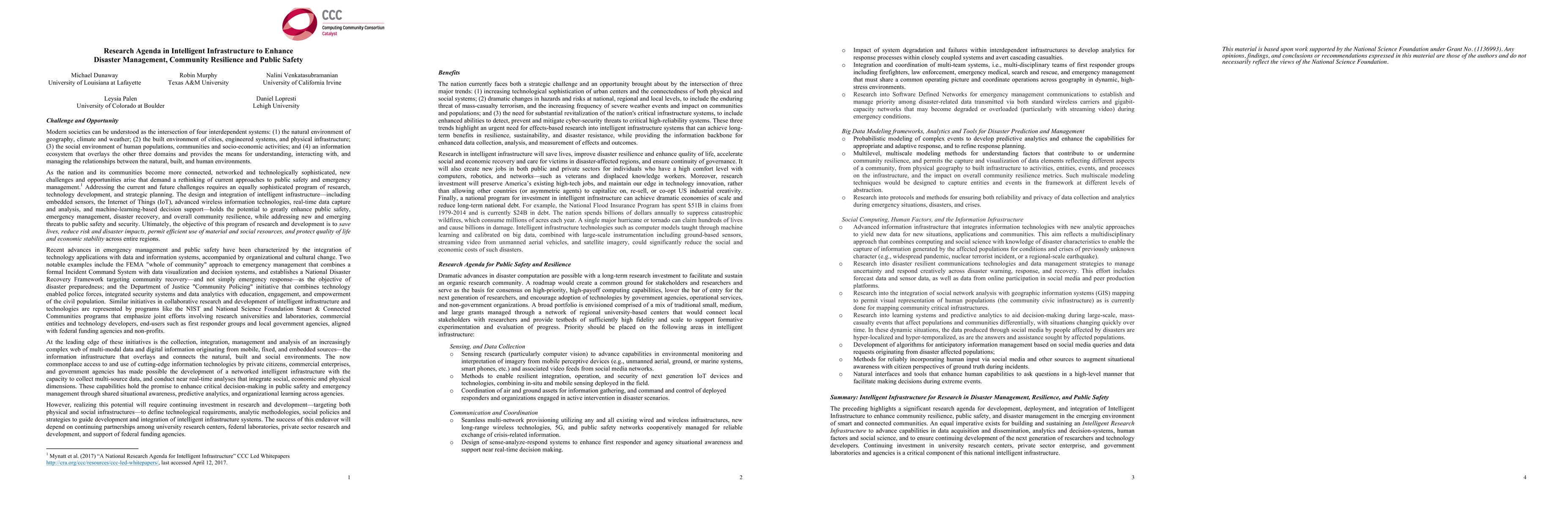 This paper outlines a research agenda focused on intelligent infrastructure to enhance disaster management, community resilience, and public safety. It emphasizes the integration of advanced technologies like IoT and machine learning to improve emergency response and disaster recovery, aiming to save lives and protect economic stability.