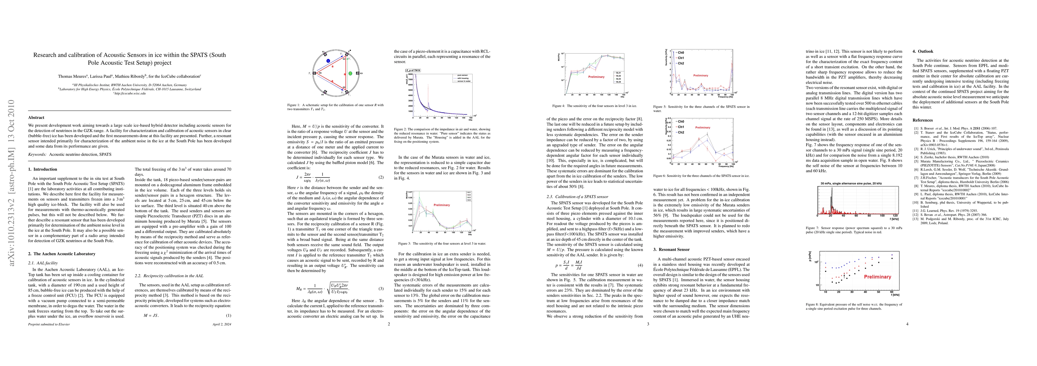 This paper details the development and initial calibration of acoustic sensors for a large-scale neutrino detector in ice, utilizing the South Pole Acoustic Test Setup (SPATS). Initial measurements and performance data from a resonant sensor designed to characterize ambient noise in the South Pole ice are presented.
