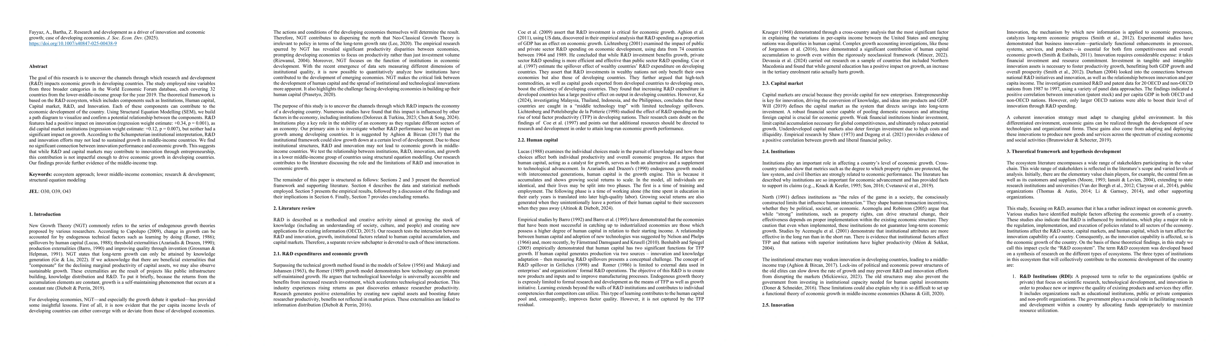 This work uniquely combines institutional economics with innovation theory, offering a comprehensive model that captures both direct and interactive effects of institutions and R&D on economic development.