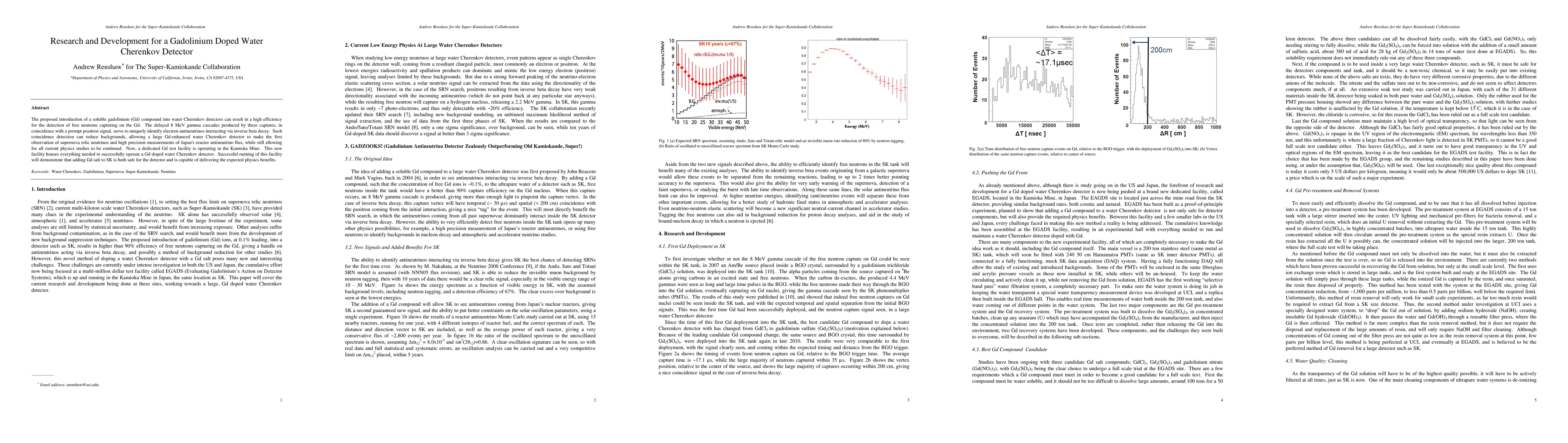 This paper explores the development of a gadolinium-doped water Cherenkov detector to enhance neutron detection efficiency and reduce background noise, potentially enabling the first observation of supernova relic neutrinos and high precision reactor antineutrino flux measurements. A dedicated test facility in the Kamioka Mine aims to validate the safety and efficacy of this approach.