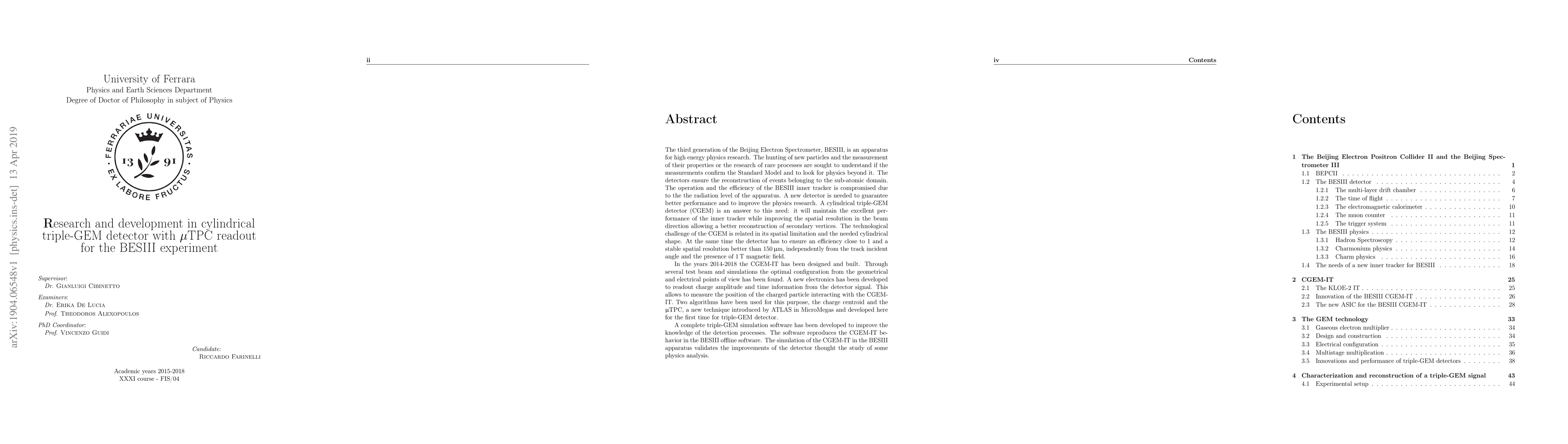 The third generation of the Beijing Electron Spectrometer, BESIII, is an apparatus for high energy physics research. The hunting of new particles and the measurement of their properties or the research of rare processes are sought to understand if the measurements confirm the Standard Model and to look for physics beyond it. The detectors ensure the reconstruction of events belonging to the sub-atomic domain. The operation and the efficiency of the BESIII inner tracker is compromised due to the the radiation level of the apparatus. A new detector is needed to guarantee better performance and to improve the physics research. A cylindrical triple-GEM detector (CGEM) is an answer to this need: it will maintain the excellent performance of the inner tracker while improving the spatial resolution in the beam direction allowing a better reconstruction of secondary vertices. The technological challenge of the CGEM is related in its spatial limitation and the needed cylindrical shape. At the same time the detector has to ensure an efficiency close to 1 and a stable spatial resolution better than 150 $\mu$m, independently from the track incident angle and the presence of 1 T magnetic field. In the years 2014-2018 the CGEM-IT has been designed and built. Through several test beam and simulations the optimal configuration from the geometrical and electrical points of view has been found. This allows to measure the position of the charged particle interacting with the CGEM-IT. Two algorithms have been used for this purpose, the charge centroid and the $\mu$TPC, a new technique introduced by ATLAS in MicroMegas and developed here for the first time for triple-GEM detector. A complete triple-GEM simulation software has been developed to improve the knowledge of the detection processes. The software reproduces the CGEM-IT behavior in the BESIII offline software.