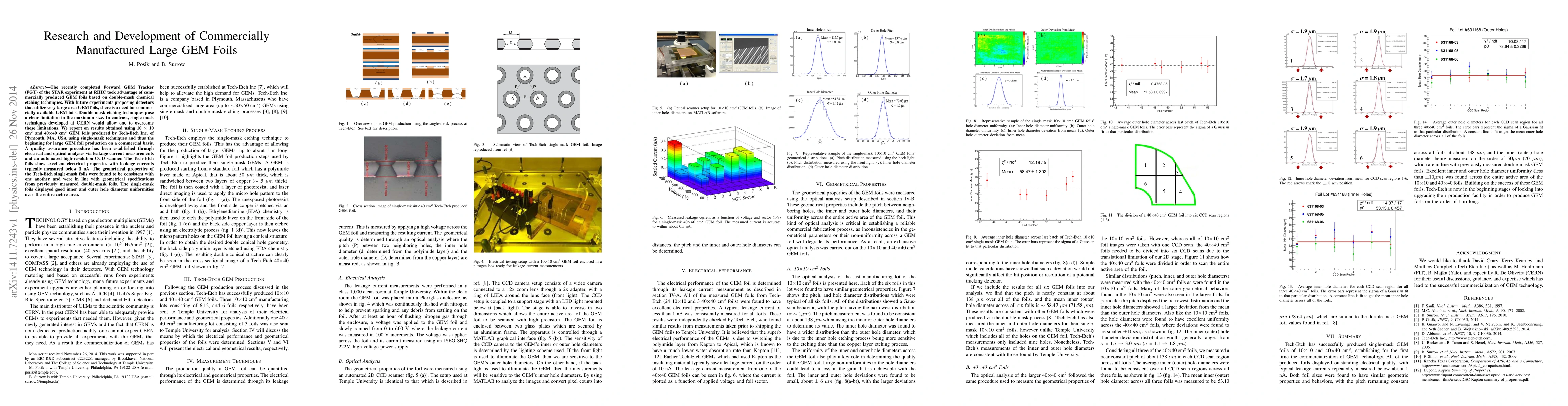 This paper reports on the development of large GEM foils for commercial use, utilizing single-mask etching techniques to overcome size limitations. Tech-Etch Inc. produced 10x10 cm² and 40x40 cm² foils with excellent electrical properties and geometrical uniformity, paving the way for large-area GEM foil production.