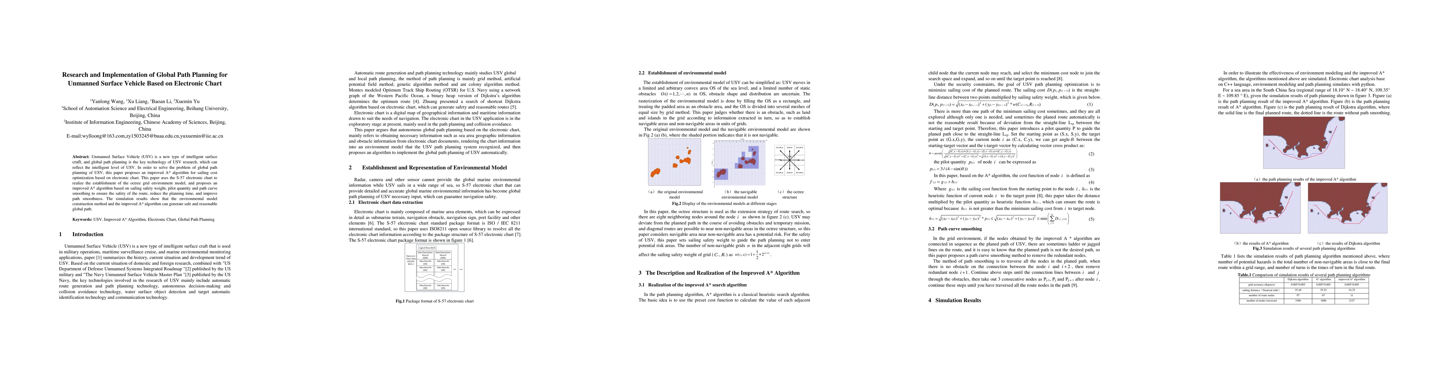 Unmanned Surface Vehicle (USV) is a new type of intelligent surface craft, and global path planning is the key technology of USV research, which can reflect the intelligent level of USV. In order to solve the problem of global path planning of USV, this paper proposes an improved A* algorithm for sailing cost optimization based on electronic charts. This paper uses the S-57 electronic chart to realize the establishment of the octree grid environment model, and proposes an improved A* algorithm based on sailing safety weight, pilot quantity and path curve smoothing to ensure the safety of the route, reduce the planning time, and improve path smoothness. The simulation results show that the environmental model construction method and the improved A* algorithm can generate safe and reasonable global path.