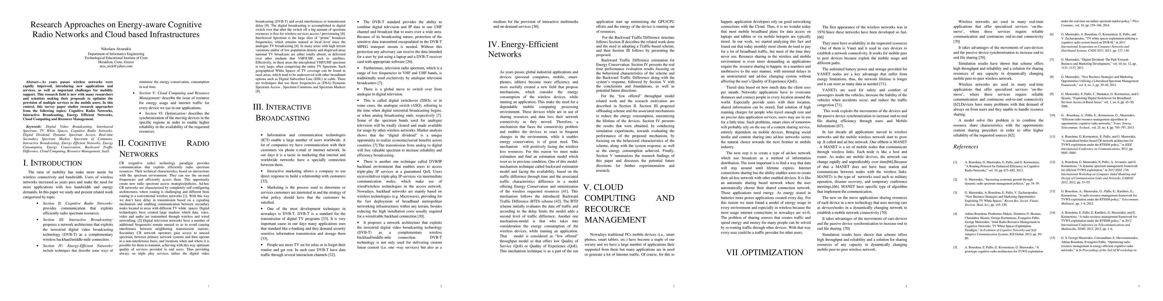 This paper surveys research approaches optimizing wireless networks, focusing on Cognitive Radio Networks, Interactive Broadcasting, Energy Efficient Networks, Cloud Computing, and Resource Management to enhance service provision for mobile users. It highlights the challenges and innovations in energy-aware cognitive radio and cloud-based infrastructures.