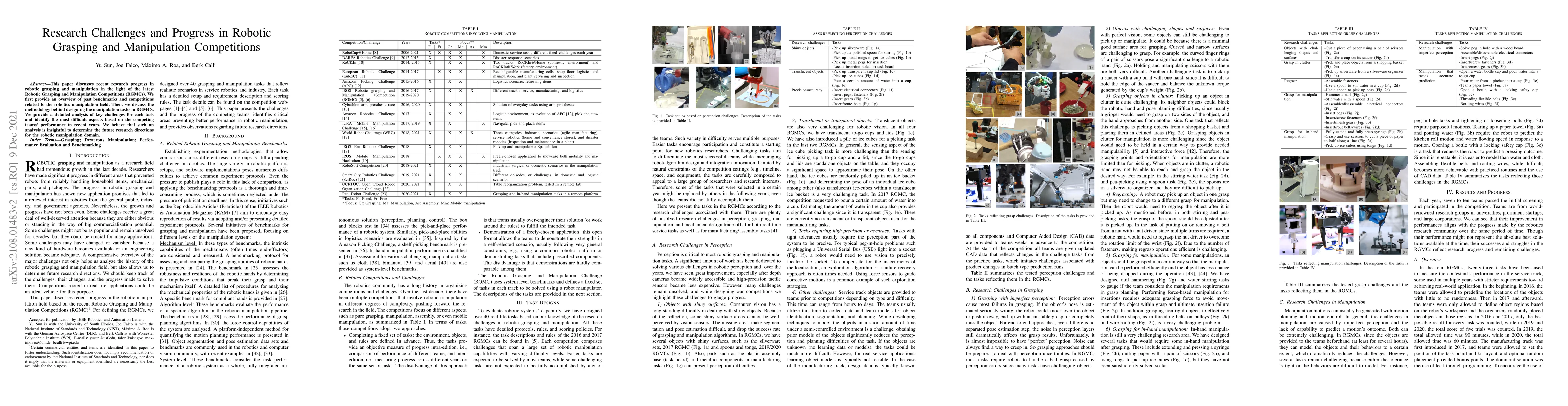 This paper discusses recent research progress in robotic grasping and manipulation in the light of the latest Robotic Grasping and Manipulation Competitions (RGMCs). We first provide an overview of past benchmarks and competitions related to the robotics manipulation field. Then, we discuss the methodology behind designing the manipulation tasks in RGMCs. We provide a detailed analysis of key challenges for each task and identify the most difficult aspects based on the competing teams' performance in recent years. We believe that such an analysis is insightful to determine the future research directions for the robotic manipulation domain.