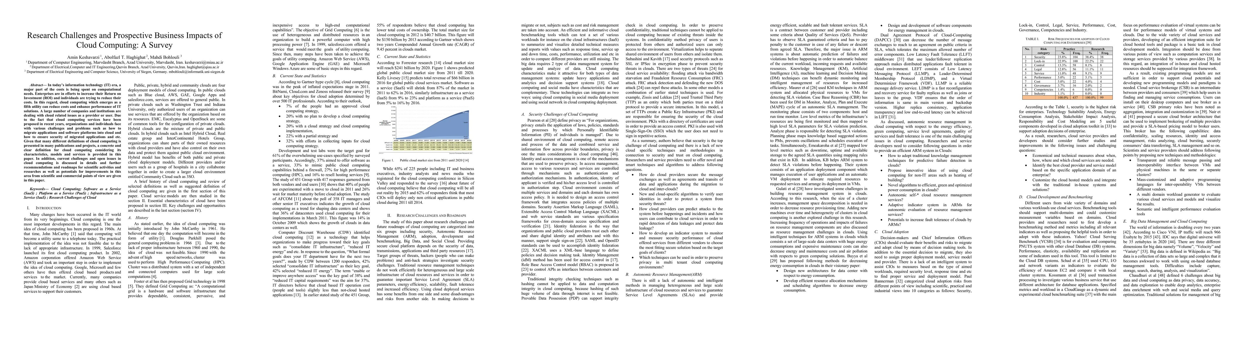 This paper surveys the challenges and business impacts of cloud computing, providing a clear definition and discussing current issues like application migration and security. It also offers recommendations for future research and potential improvements from both scientific and commercial perspectives.