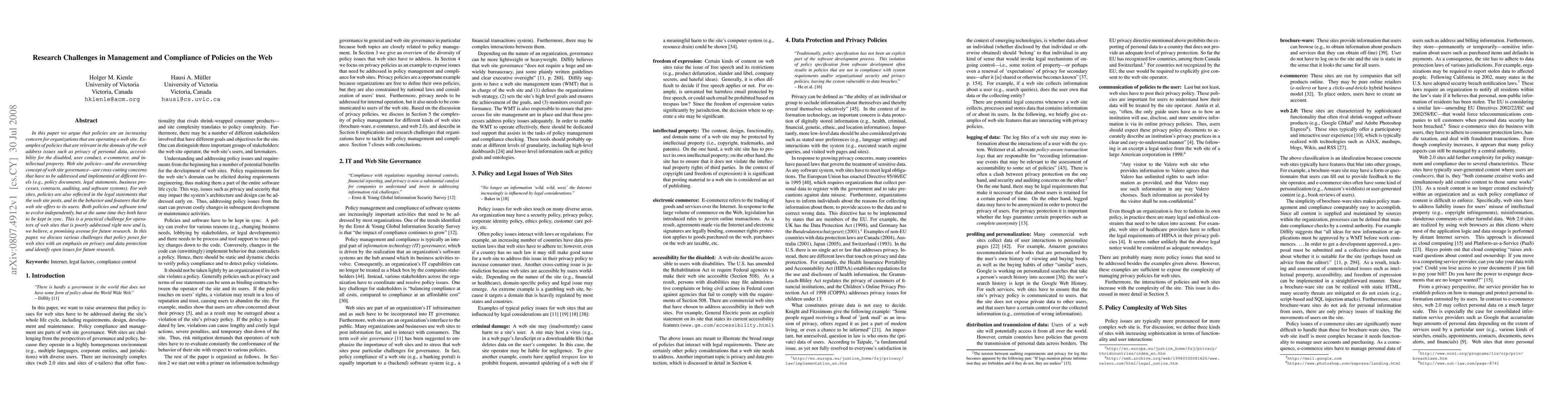 Web site policies are a growing concern for organizations due to issues like privacy, accessibility, and intellectual property. This paper highlights challenges in managing and enforcing these policies, emphasizing the need for future research into policy management and governance.